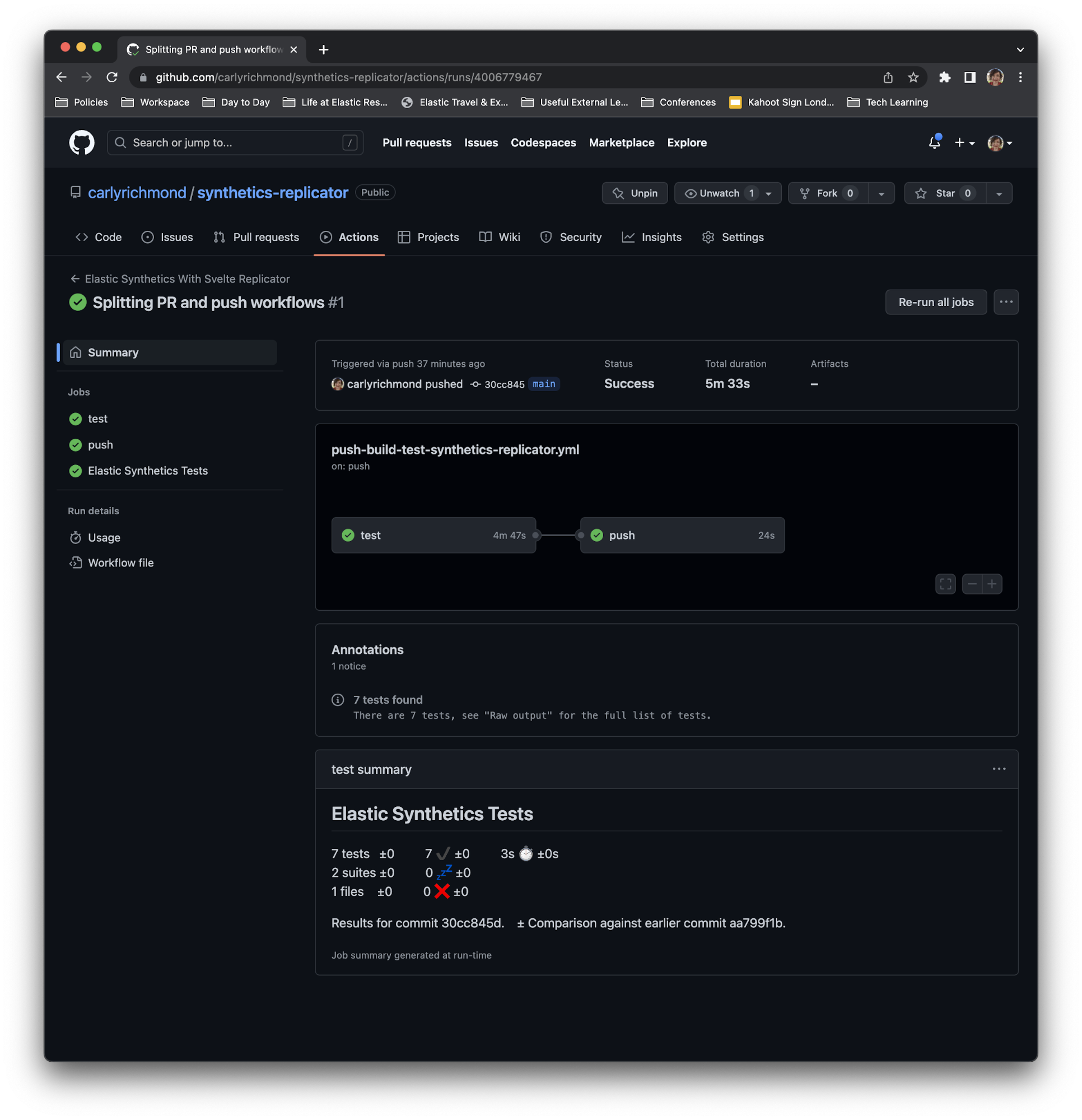 请注意,与本地机器上执行的旅程不同,我们在执行 npx @elastic/synthetics 时使用了 --reporter=junit 选项,以提供 CI 作业中用户旅程通过验证(或未能通过 - 很遗憾,有时就会发生这种情况)的可见性。