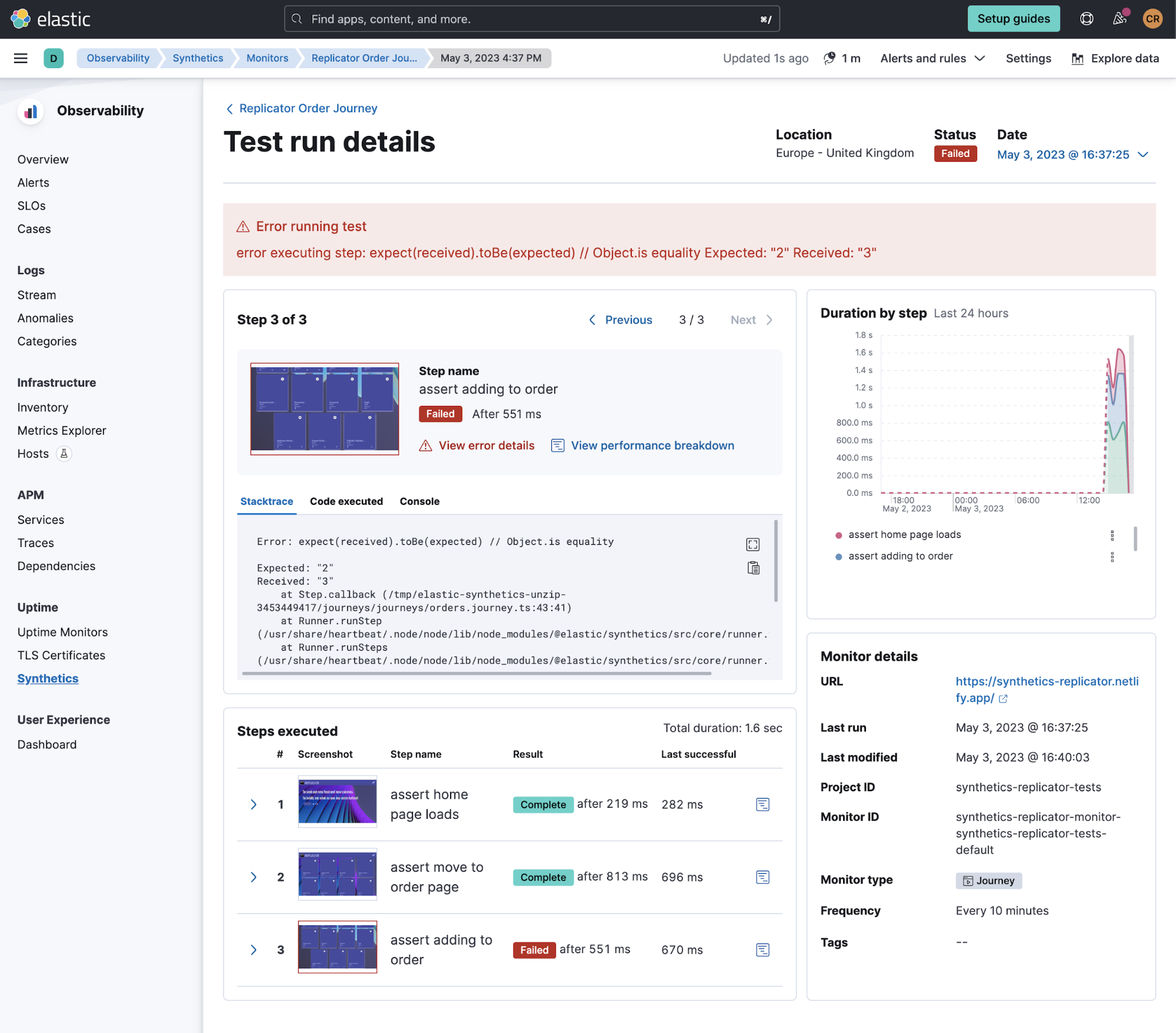 Elastic 最近引入了合成监测,正如我们在之前博文中所强调的,它可以完全取代端到端测试。通过合并使用单一工具来早期验证用户工作流,便可提供一种通用的语言来重现用户问题,以验证修复的结果。