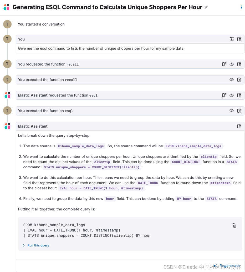 Elastic AI Assistant for Observability 现在包含 ES|QL 功能,允许用户使用自然语言来解释查询,并让 AI 助手提供 ES|QL 查询语法,解释查询的作用,并提供提示运行请求的查询。