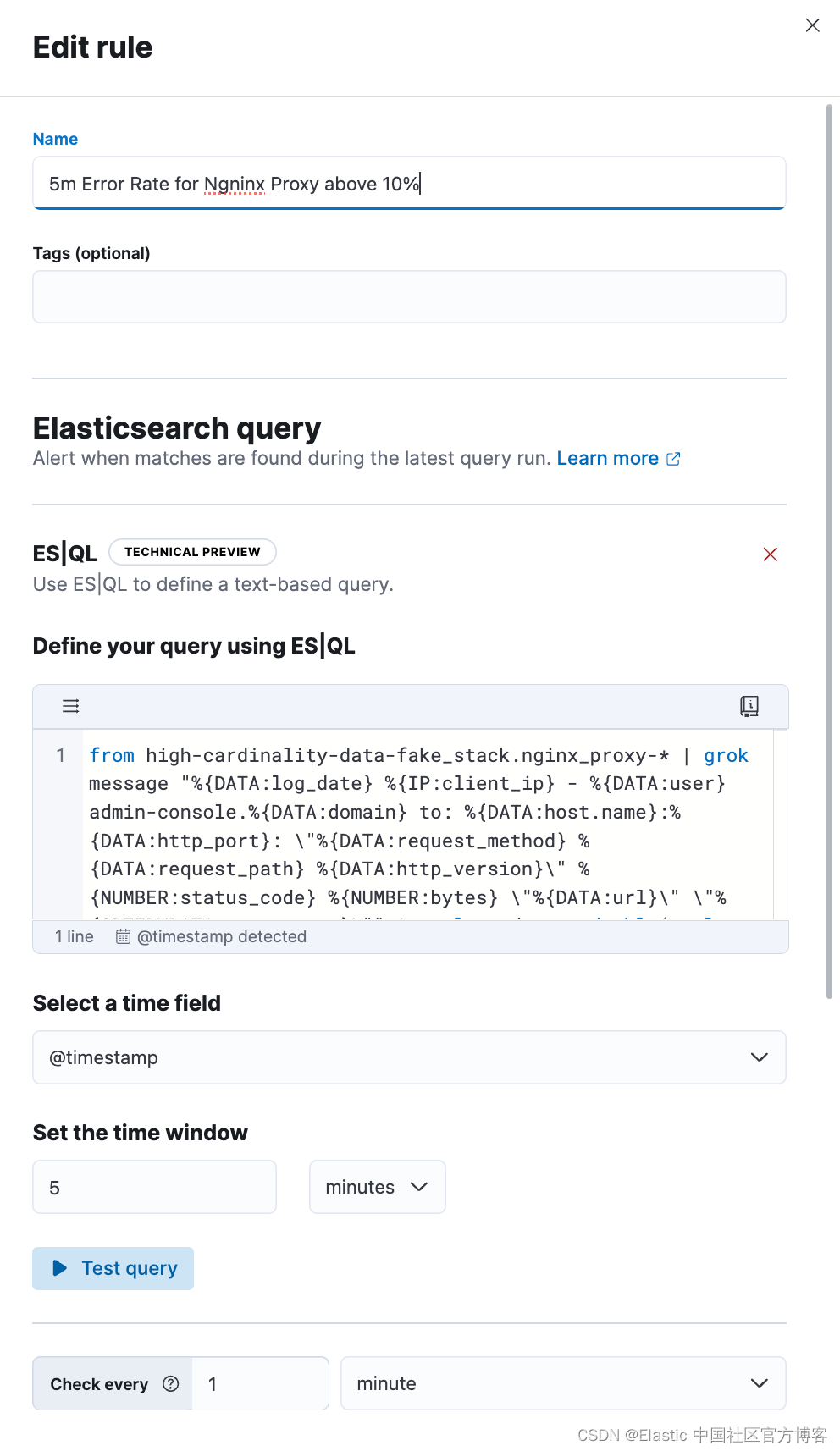 在下面的示例中,我们使用 ES|QL 查询来查找原始、未解析的 Nginx 日志中的域。 我们对错误率高于 10% 的领域感兴趣。 此查询帮助我们识别有问题的域。 我们将此查询合并到我们的 ES|QL 警报规则中,以便在发生此类问题时通知我们。