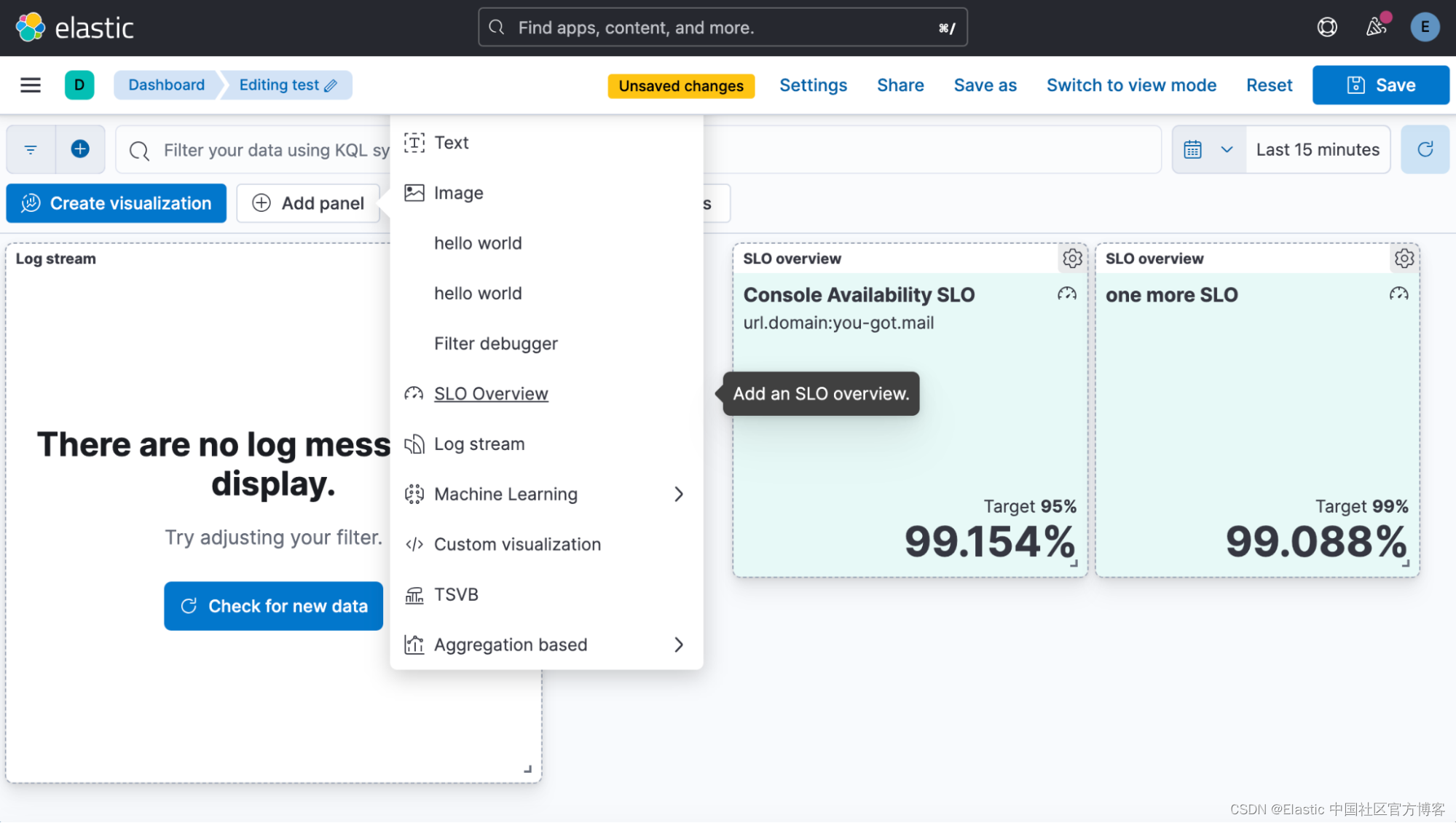 用户现在可以将 SLO 概述添加到仪表板,这将允许他们查看 SLO 状态以及其他相关的可视化效果。