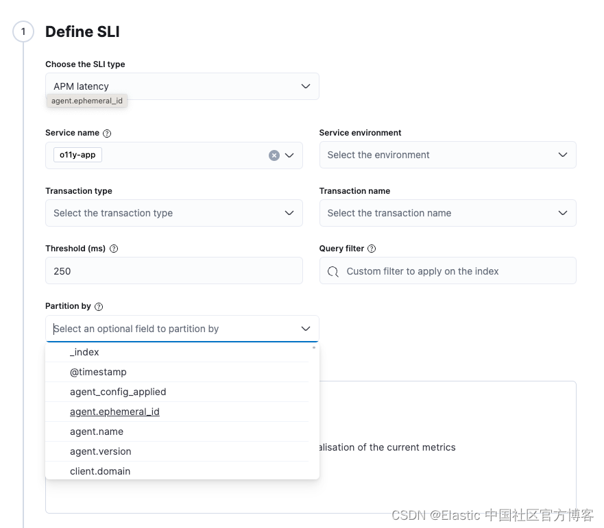 在 8.11 中,APM 延迟和错误率的 SLI 包括跨指标类型进行分组以及对组中每个单独指标进行分区的能力。