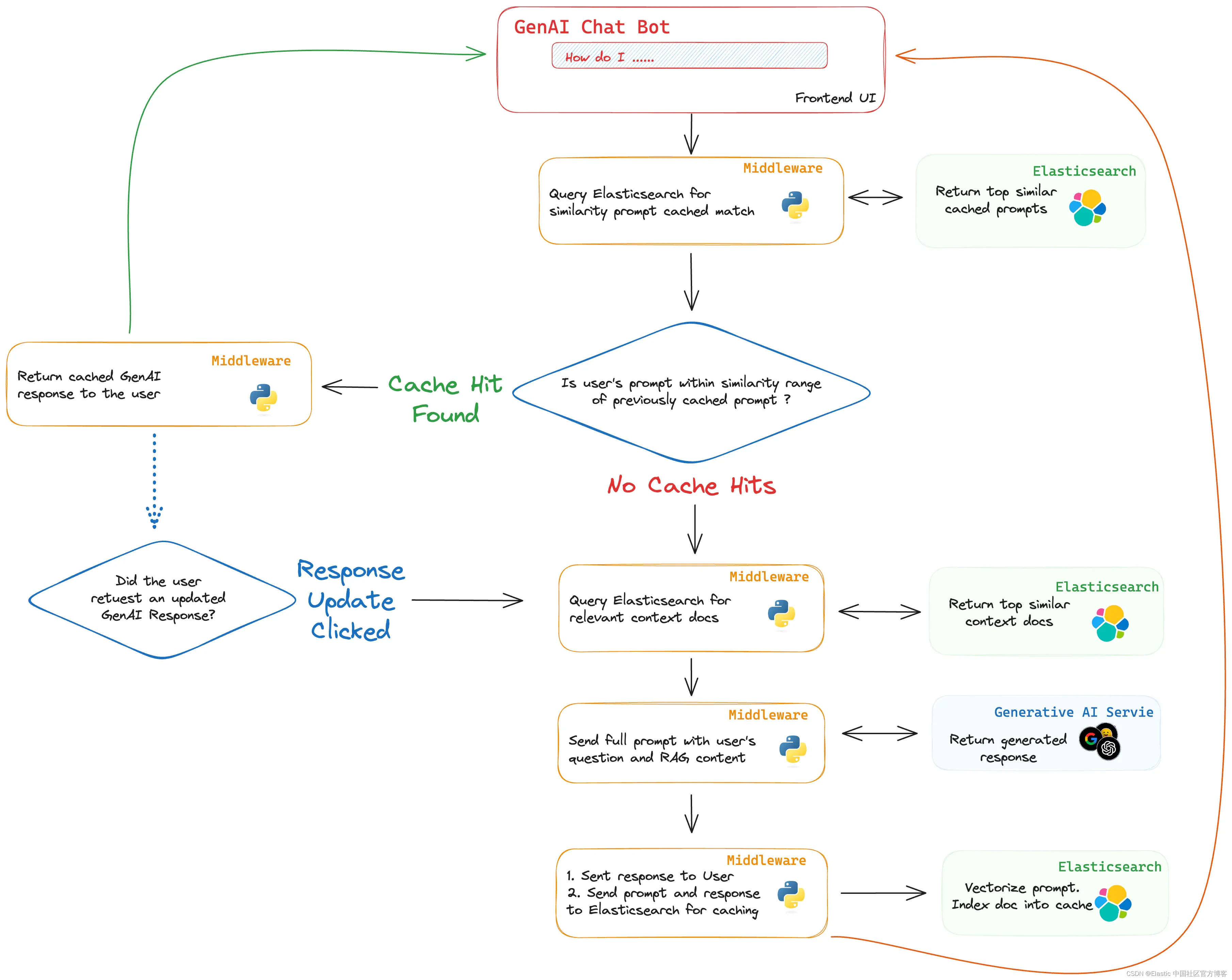 要将 Elasticsearch 集成为缓存层,工作流程可以如下进行:出现新提示并查询 Elasticsearch,包括对提示进行向量化,以查找任何紧密匹配的现有向量。 如果找到匹配项,则返回先前生成的针对先前提示的答案。 如果没有,问题将经历通常的 RAG 流程,新生成的答案将存储回 Elasticsearch 以供将来使用。 你甚至可以为用户提供坚持要求 “新鲜” 答案的选项,从而在他们愿意的情况下绕过缓存。