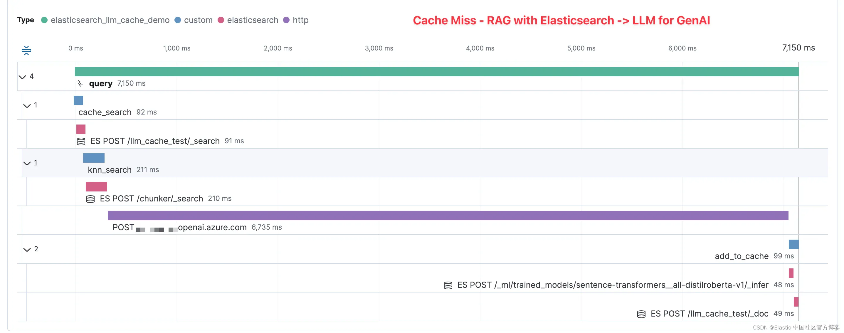 这是一条 APM 跟踪,显示输入新提示(没有匹配的缓存)时所花费的时间。 我们可以看到,在此示例中,示例应用程序中从用户点击提交到应用程序从 GenAI 模式返回响应的总时间花费了 7,150 毫秒,即大约 7 秒。