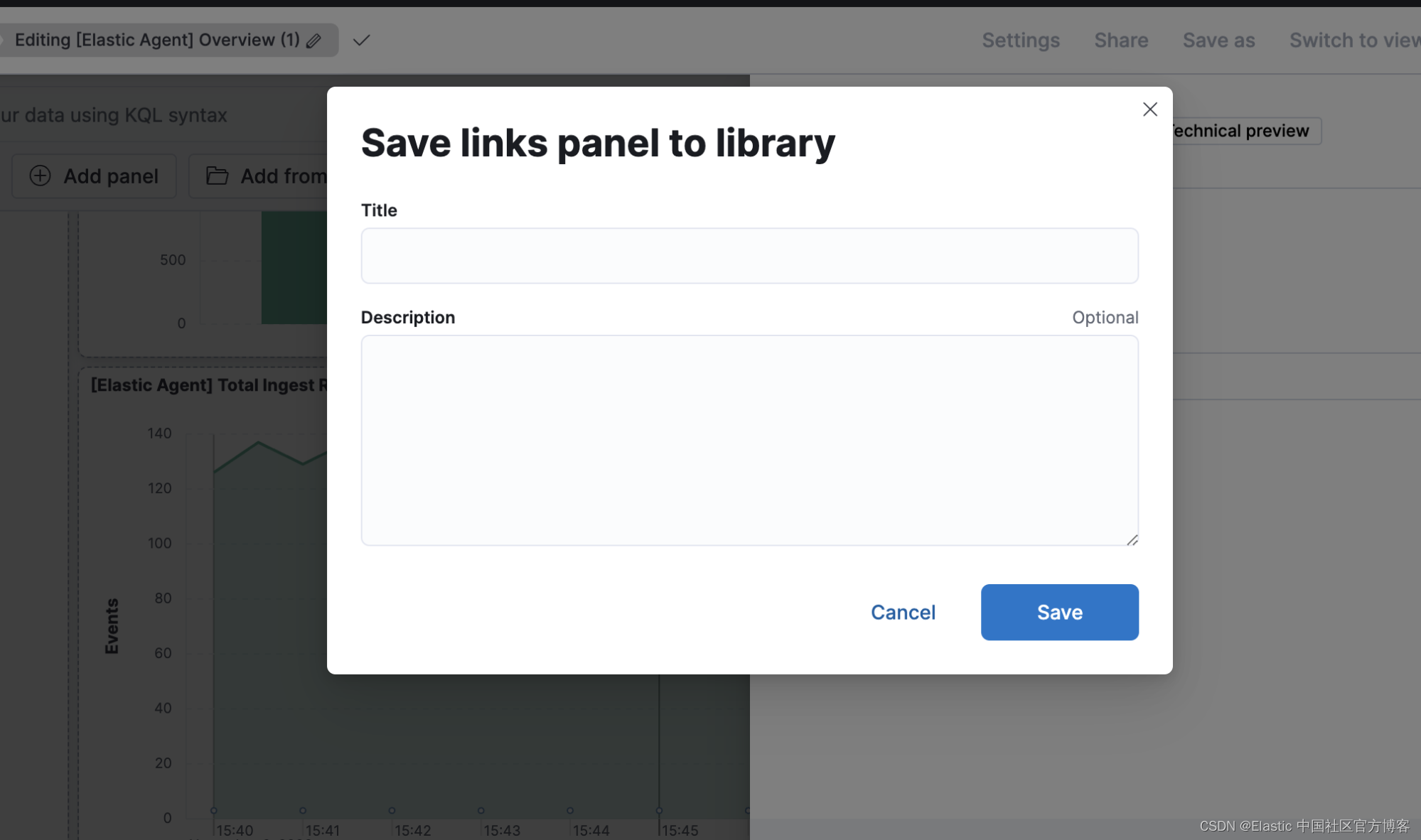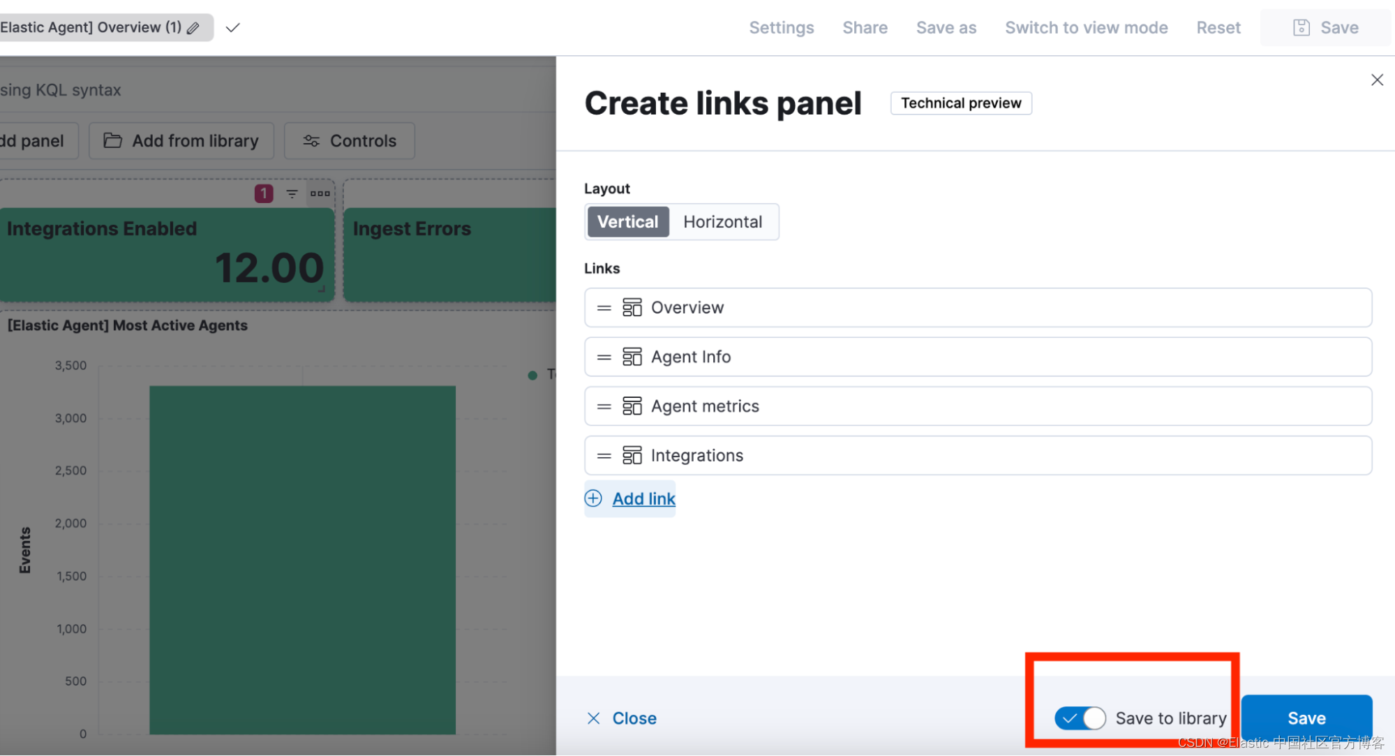 6. 单击 “Save” 之前,你会发现 “Save to library” 开关默认处于打开状态。 这将允许你稍后在其他仪表板中重用此面板。 由于我们需要将相同的面板添加到四个仪表板中,因此如果我们重复使用相同的面板而不是创建多个不同的面板,管理起来会更快、更容易。 这样,对面板的任何编辑都会自动反映在所有仪表板中。 但是,如果你不需要此功能,可以通过关闭切换来禁用此选项。 你以后始终可以通过使用面板菜单中的 “Save to library” 选项来做出决定。