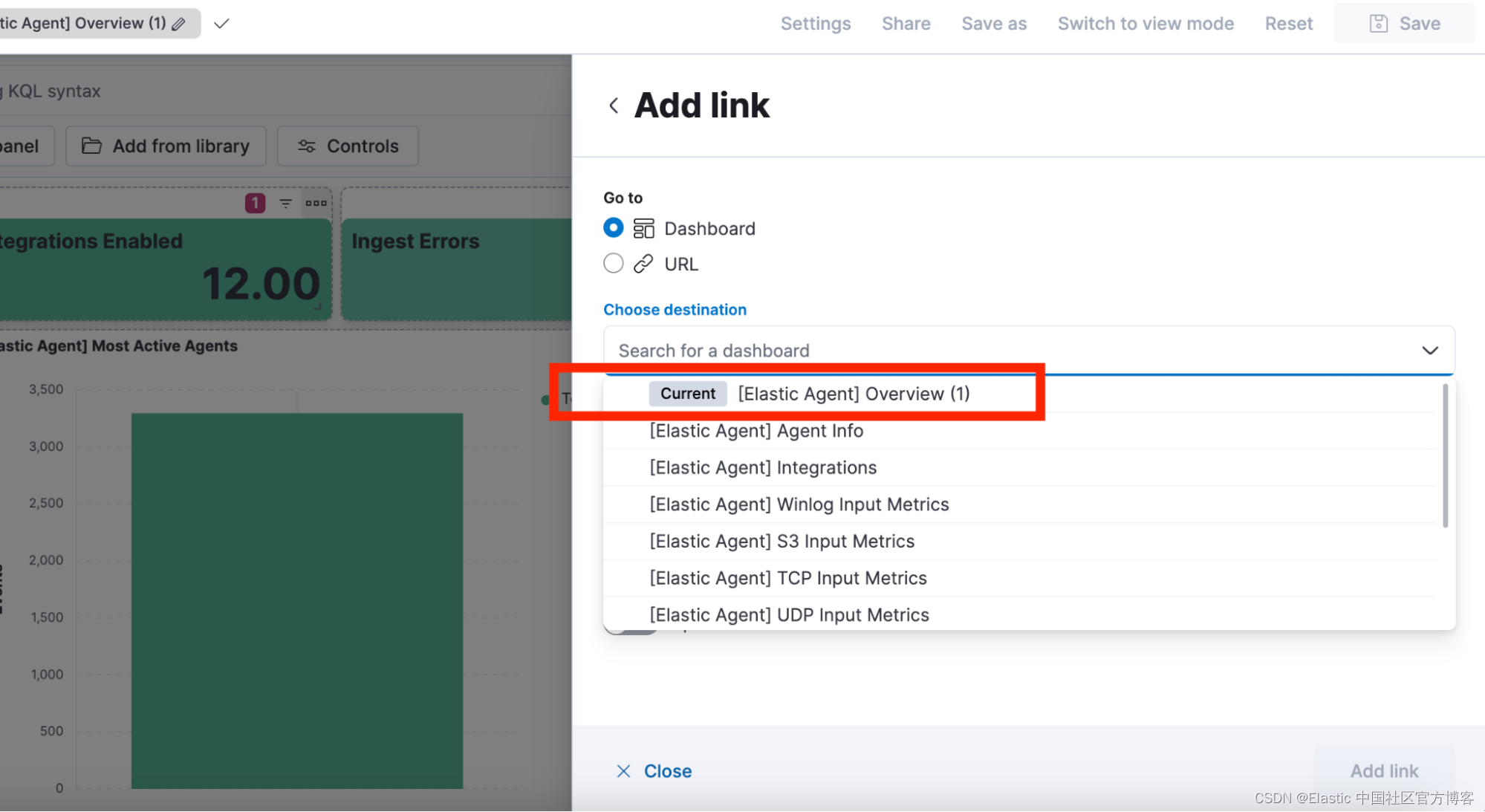 3. 你可以选择添加指向仪表板或任何其他 URL 的链接。 选择标记为 “Current” 的仪表板以添加指向打开的仪表板的链接。