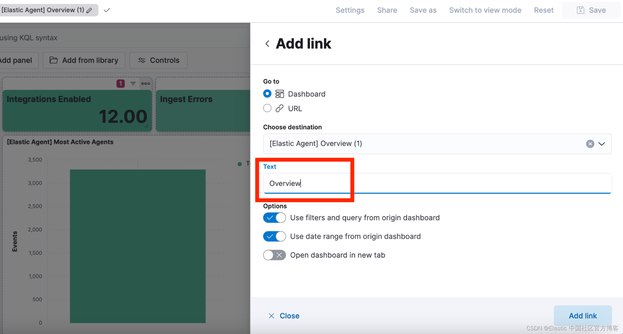 4. 如果你不想使用原始仪表板名称,请添加要在面板中显示的任何自定义文本,然后单击 Add link。