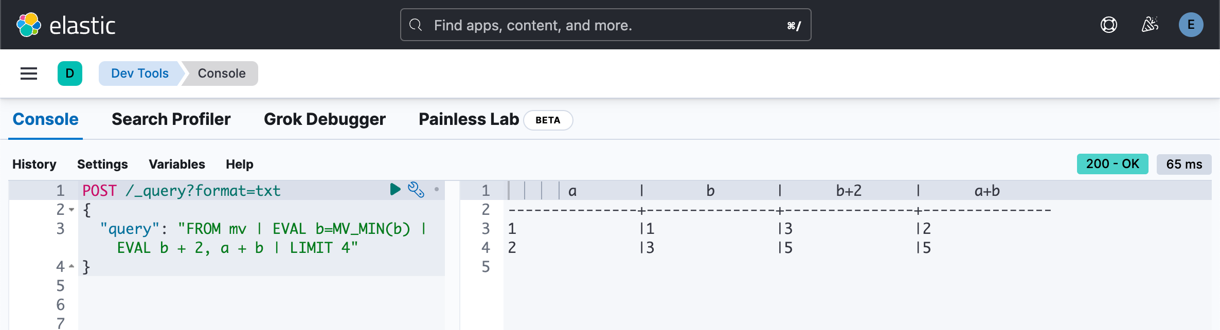 "query": "FROM mv | EVAL b=MV_MIN(b) | EVAL b + 2, a + b | LIMIT 4"