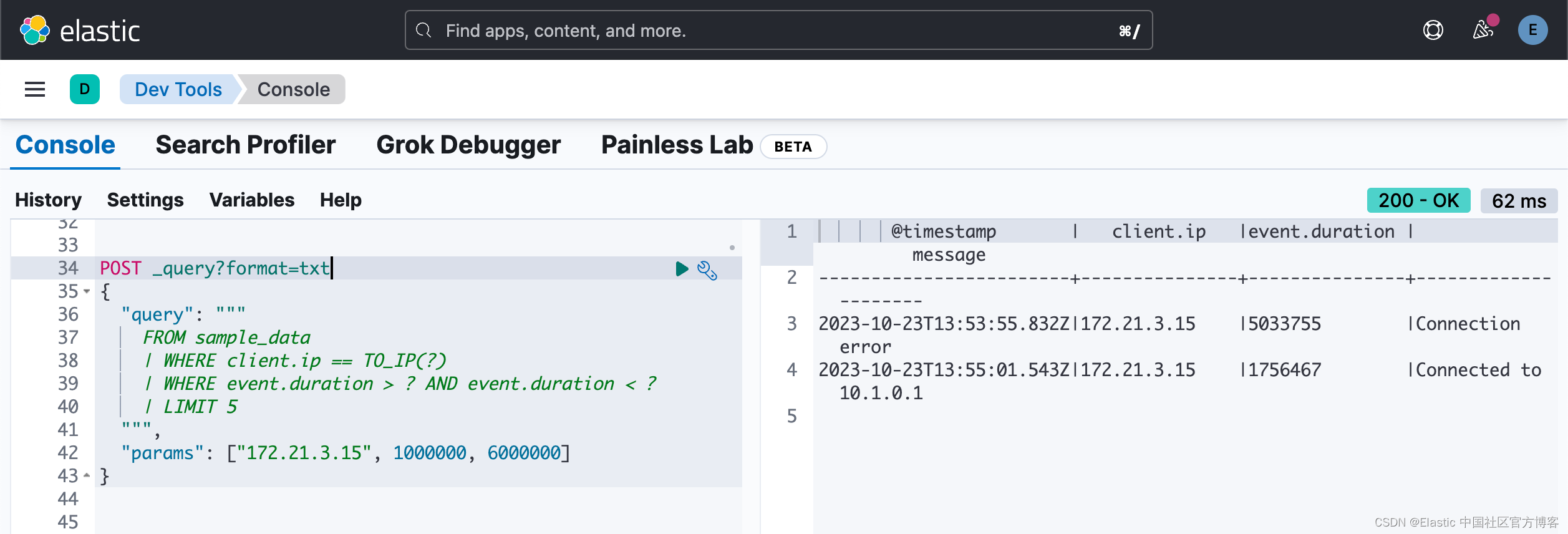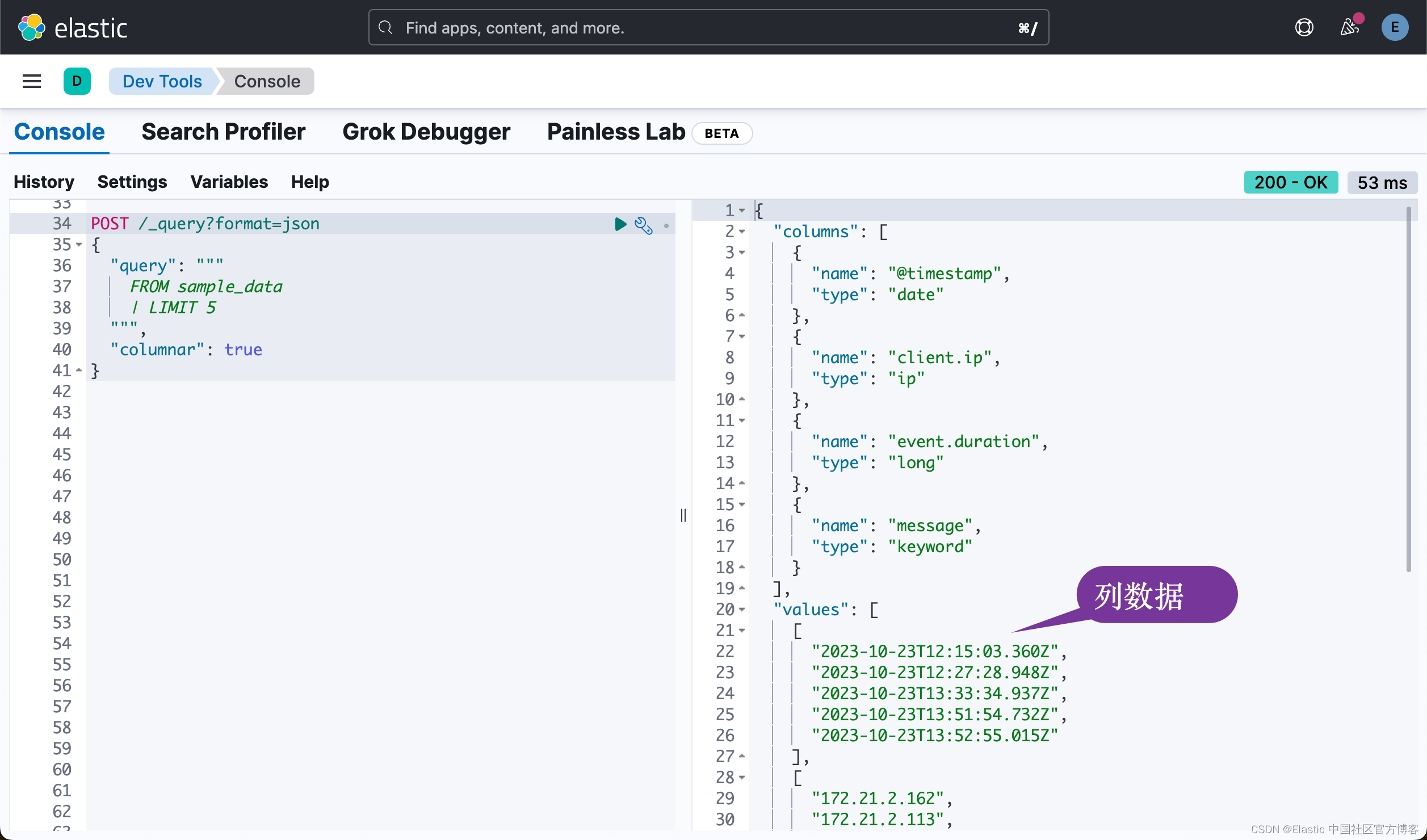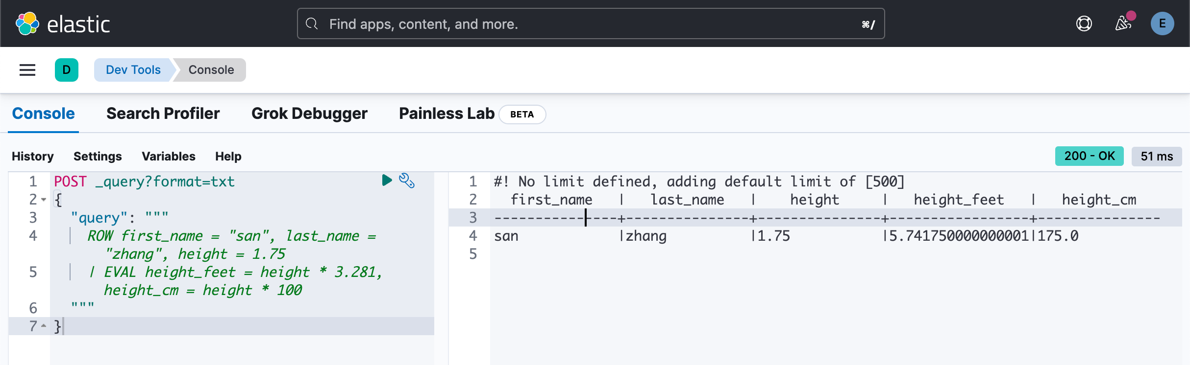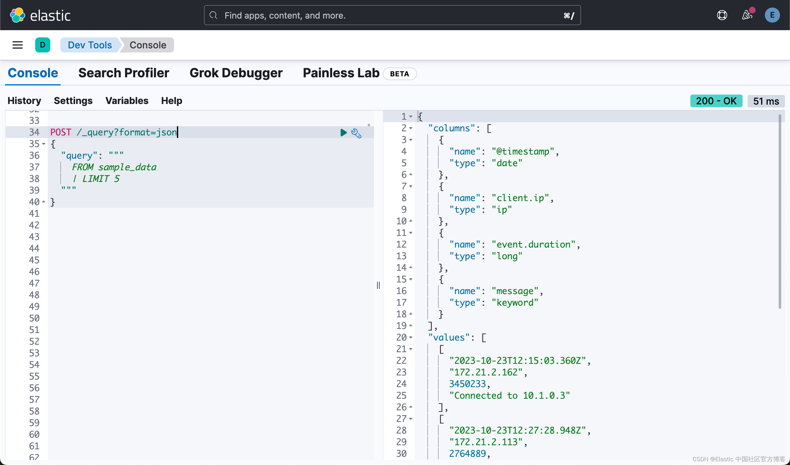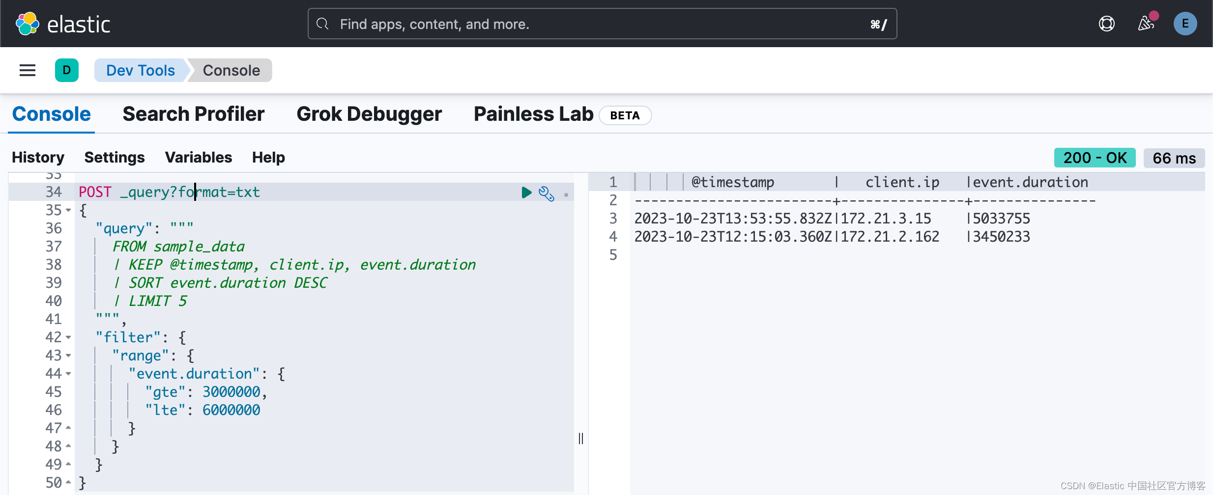 我们需要在 Kibana 的界面中,进入到 Dev Tools。通常一个 ES|QL query API 的命令格式是这样的: