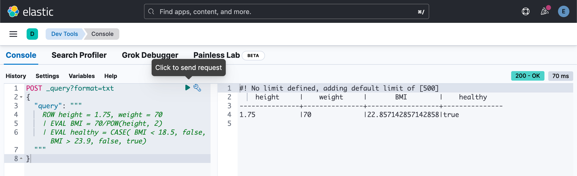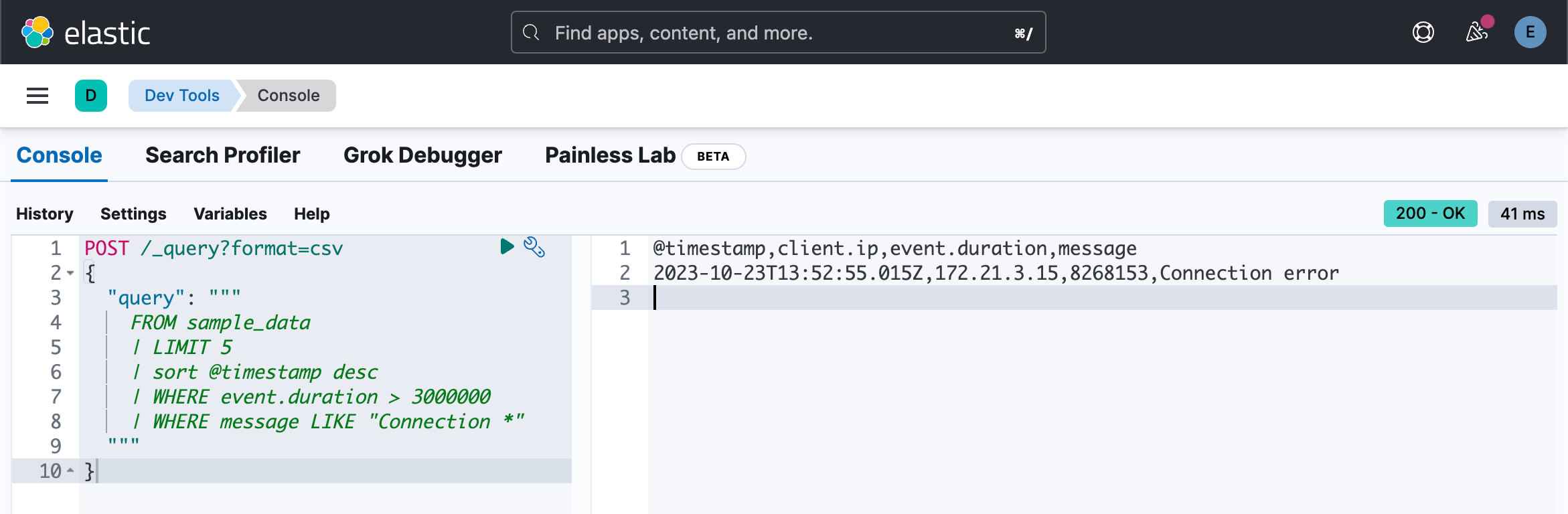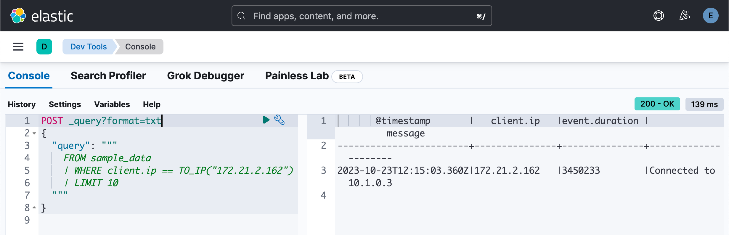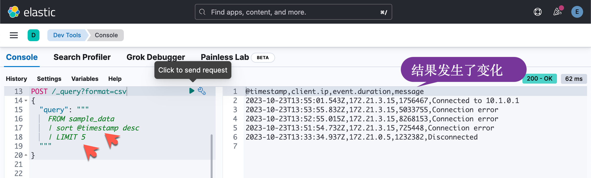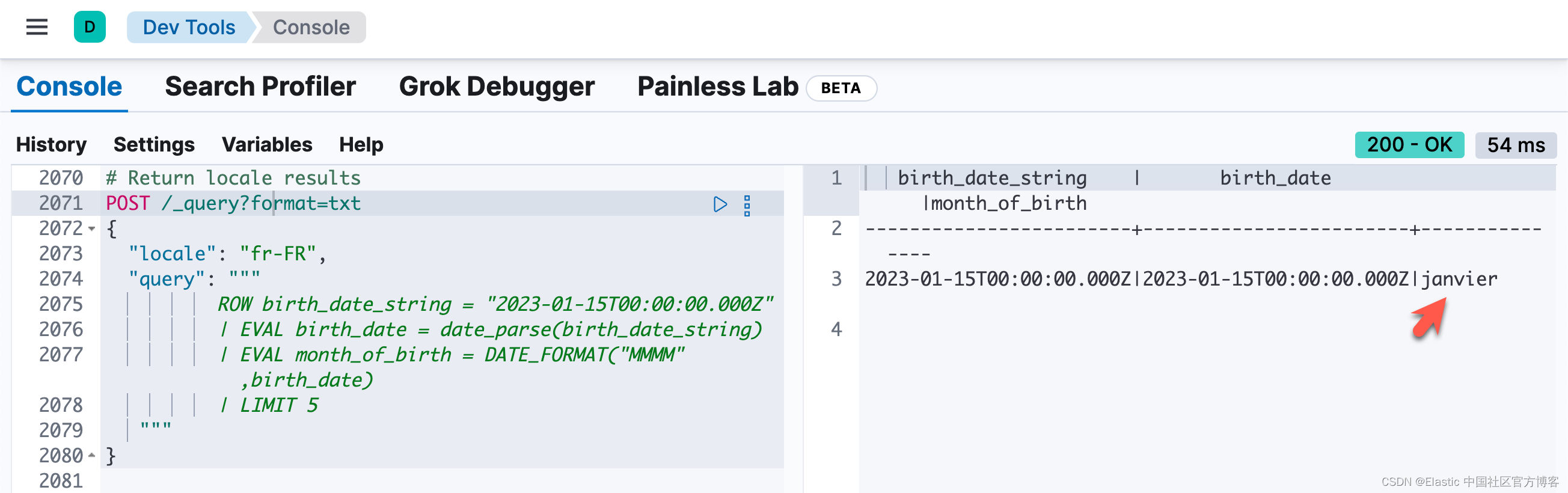 我们需要在 Kibana 的界面中,进入到 Dev Tools。通常一个 ES|QL query API 的命令格式是这样的: