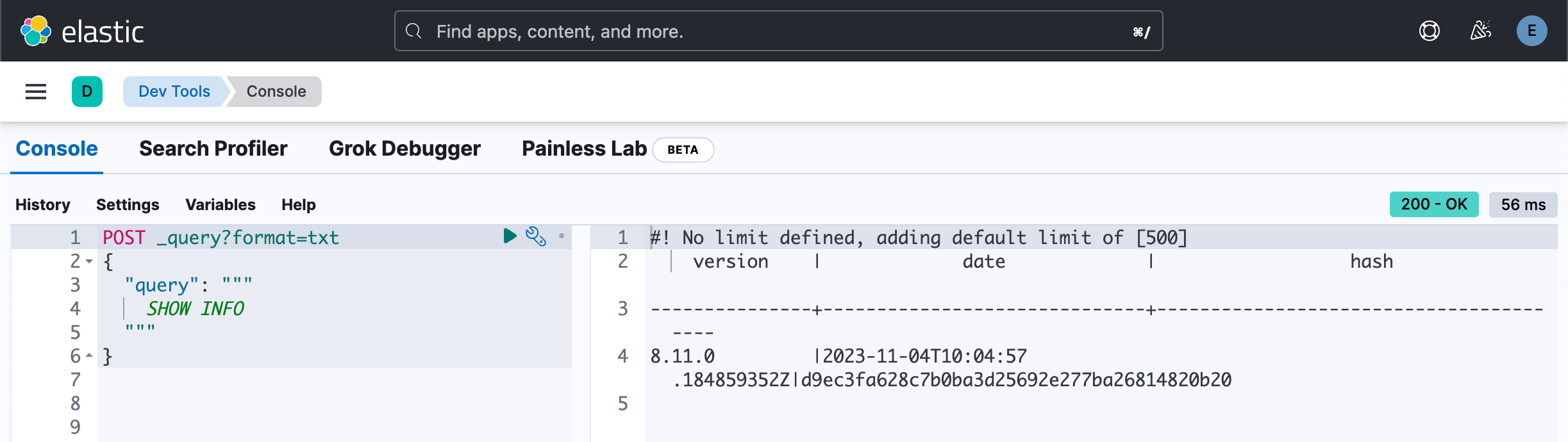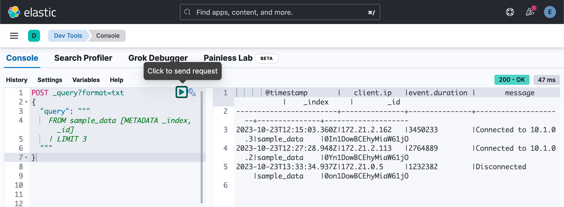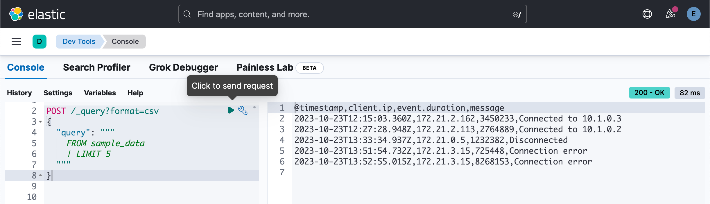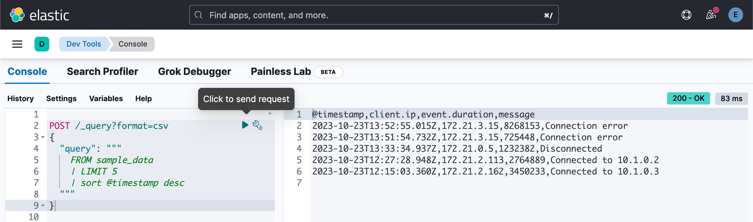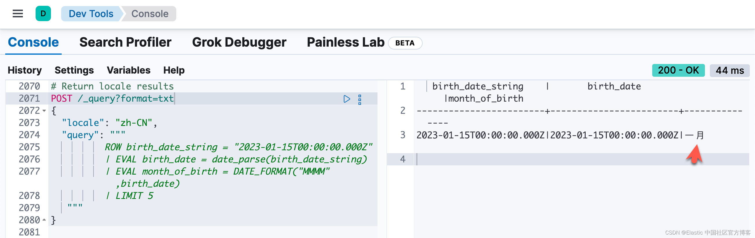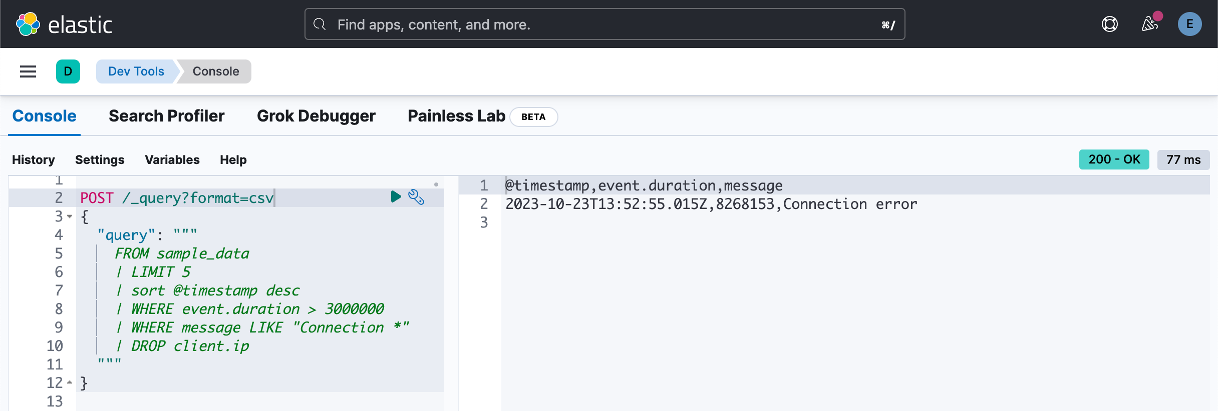 我们需要在 Kibana 的界面中,进入到 Dev Tools。通常一个 ES|QL query API 的命令格式是这样的: