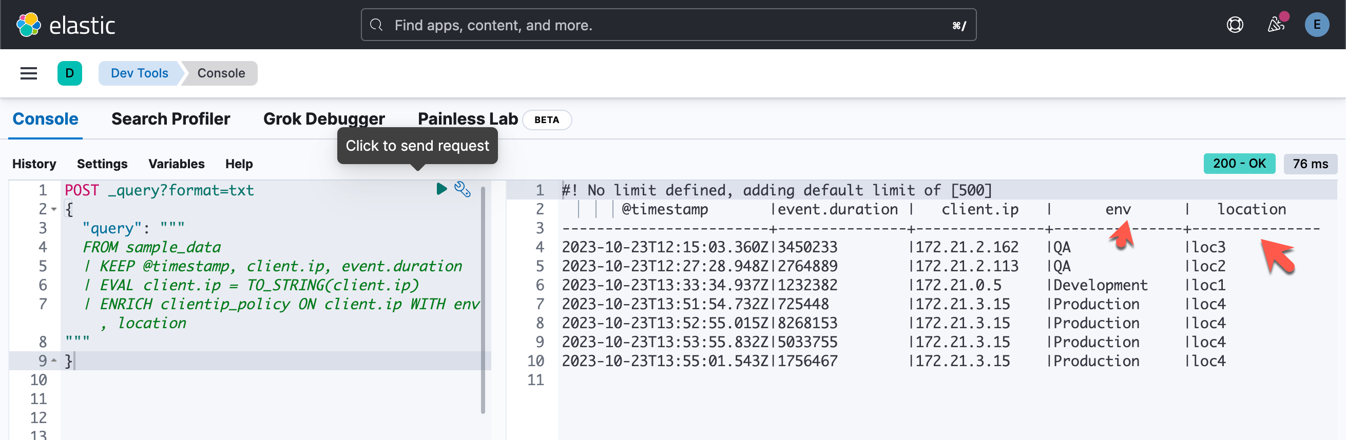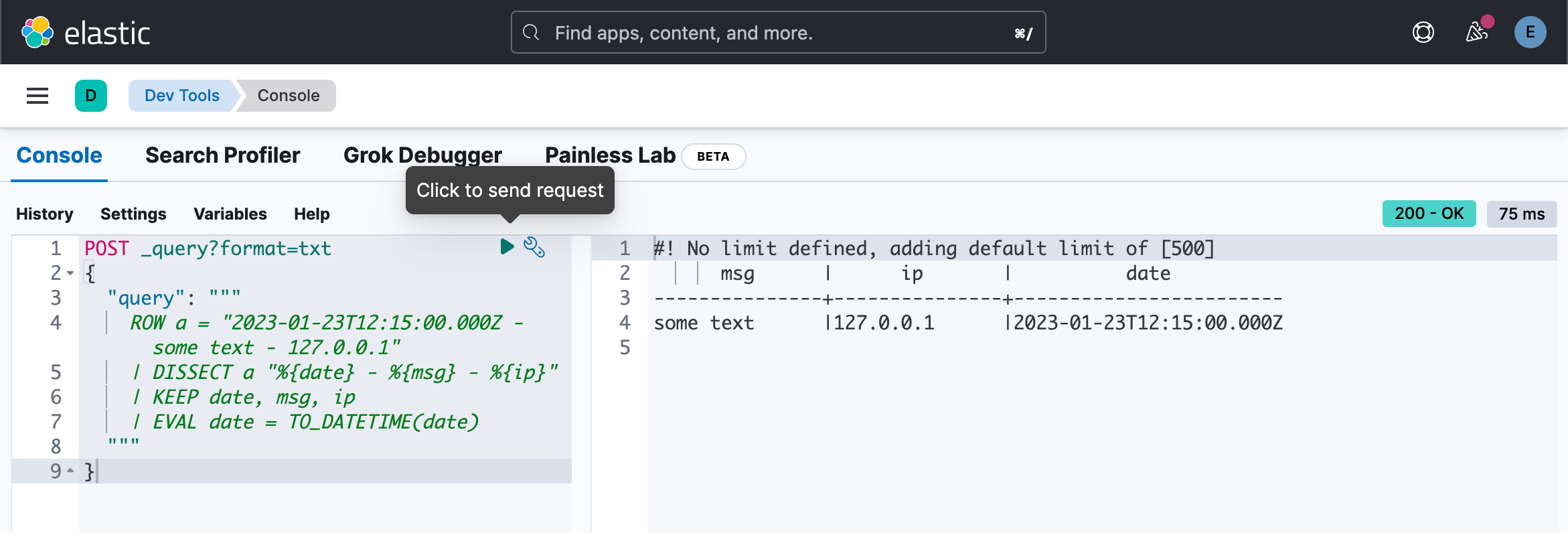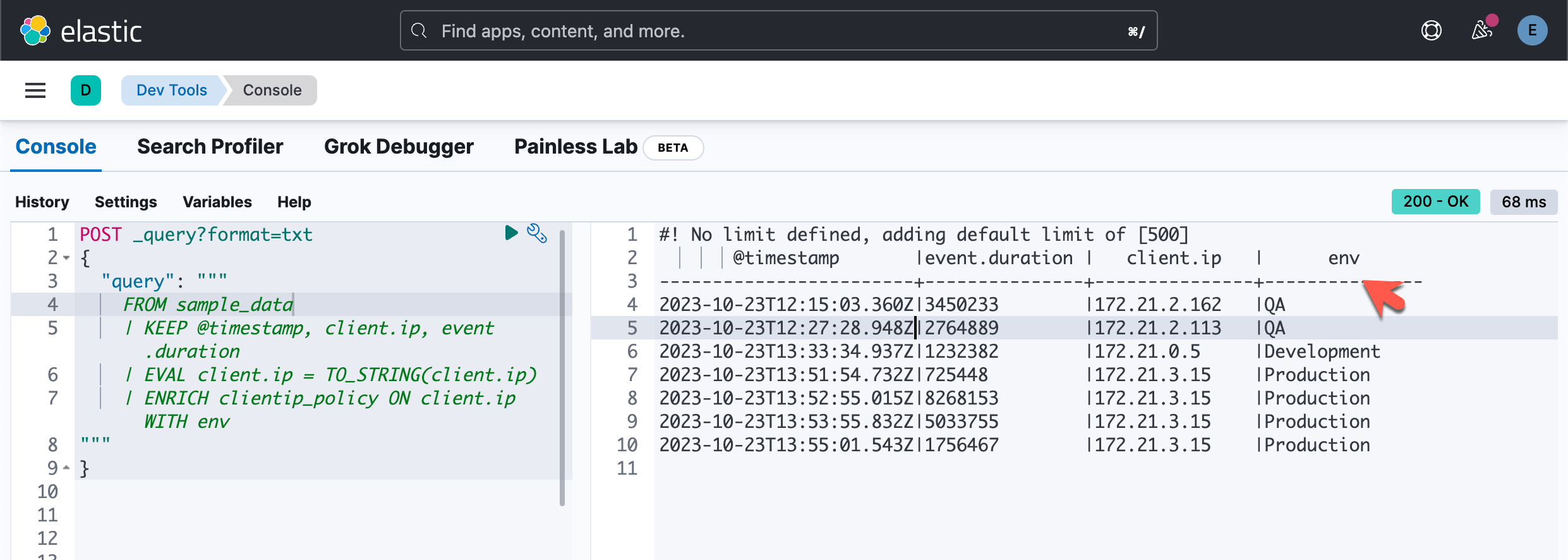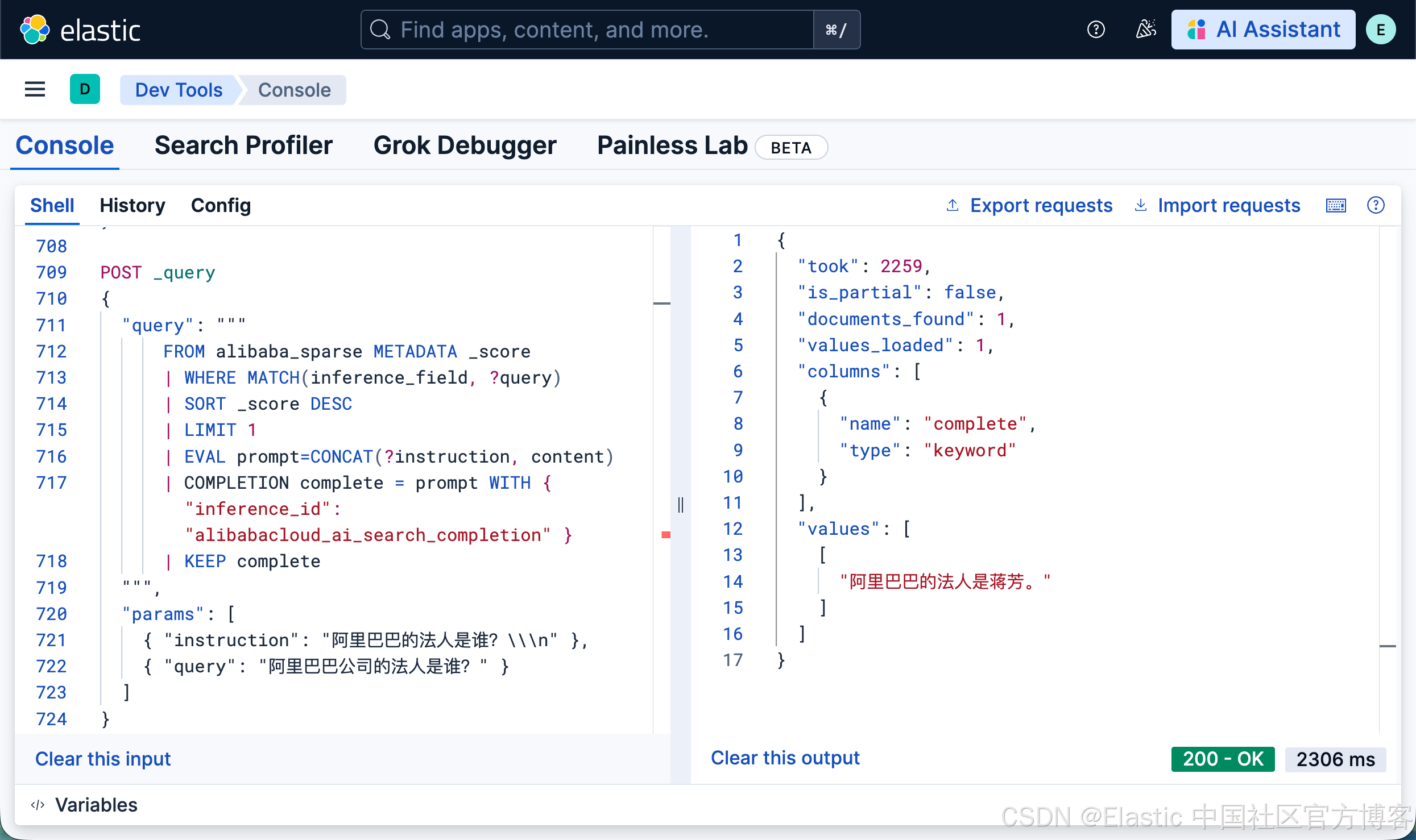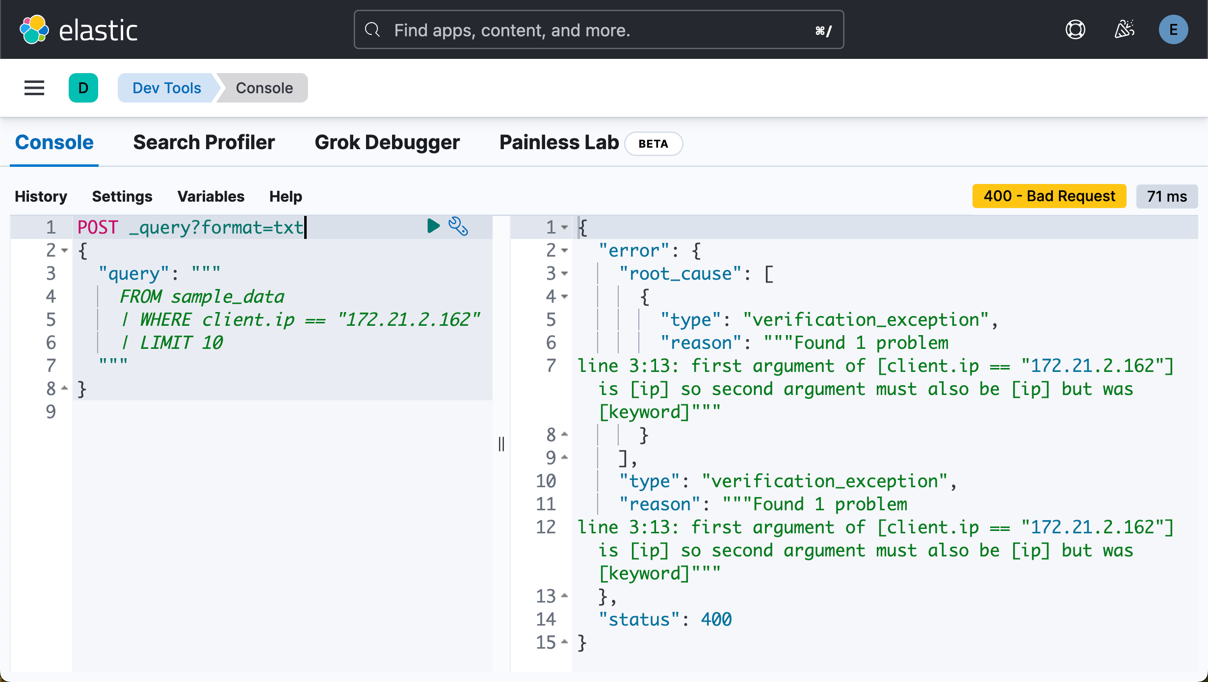 我们需要在 Kibana 的界面中,进入到 Dev Tools。通常一个 ES|QL query API 的命令格式是这样的: