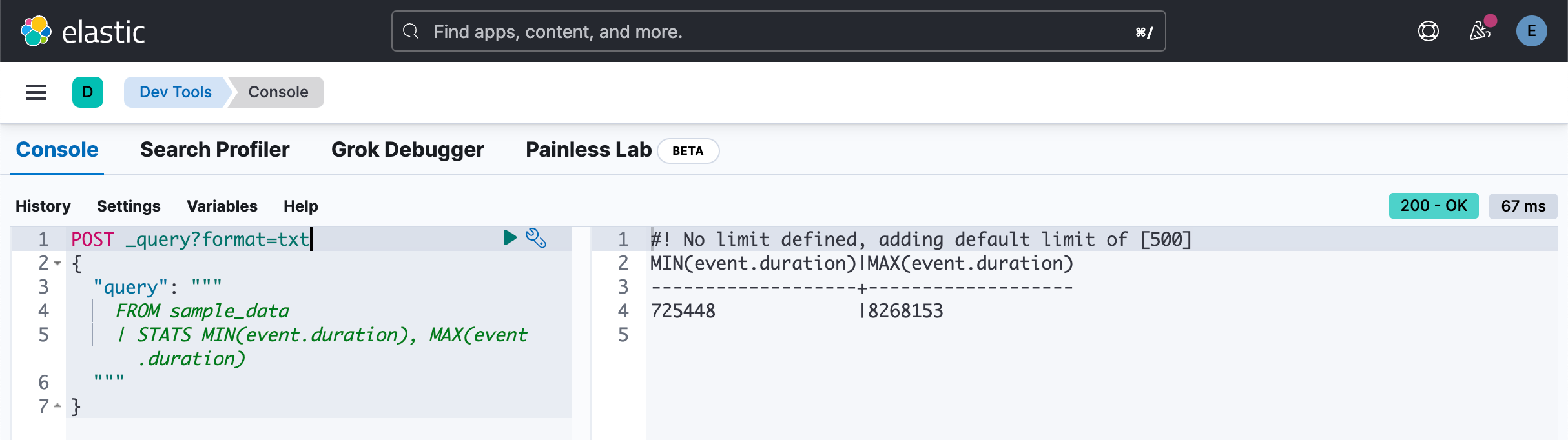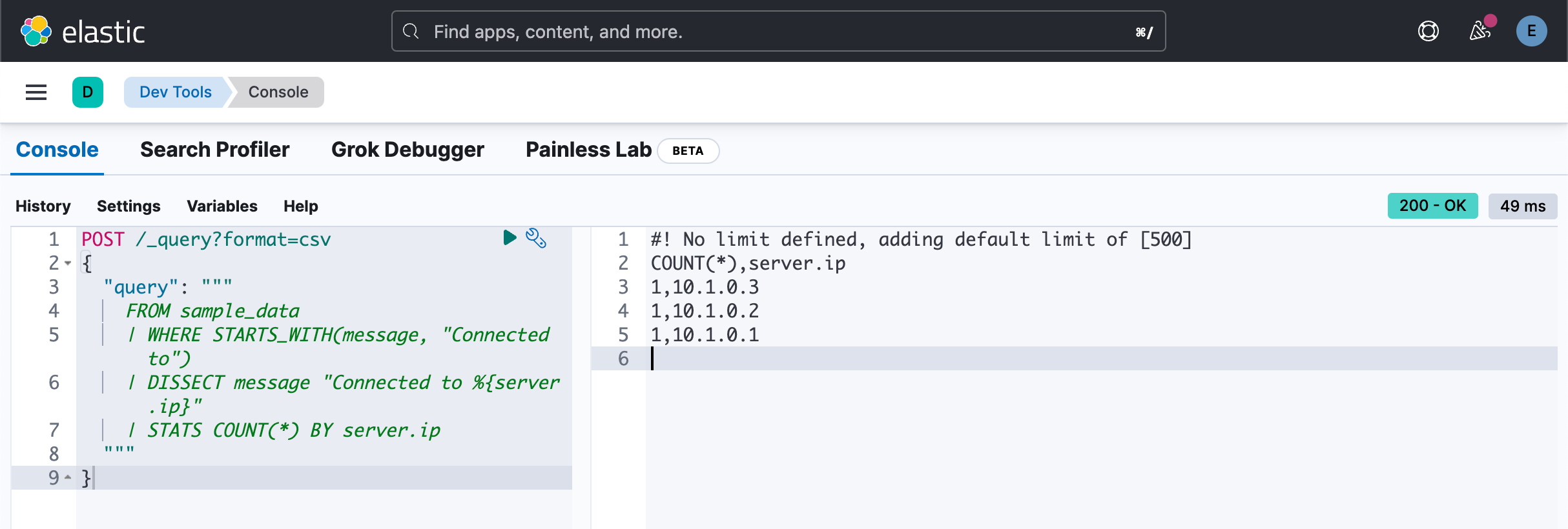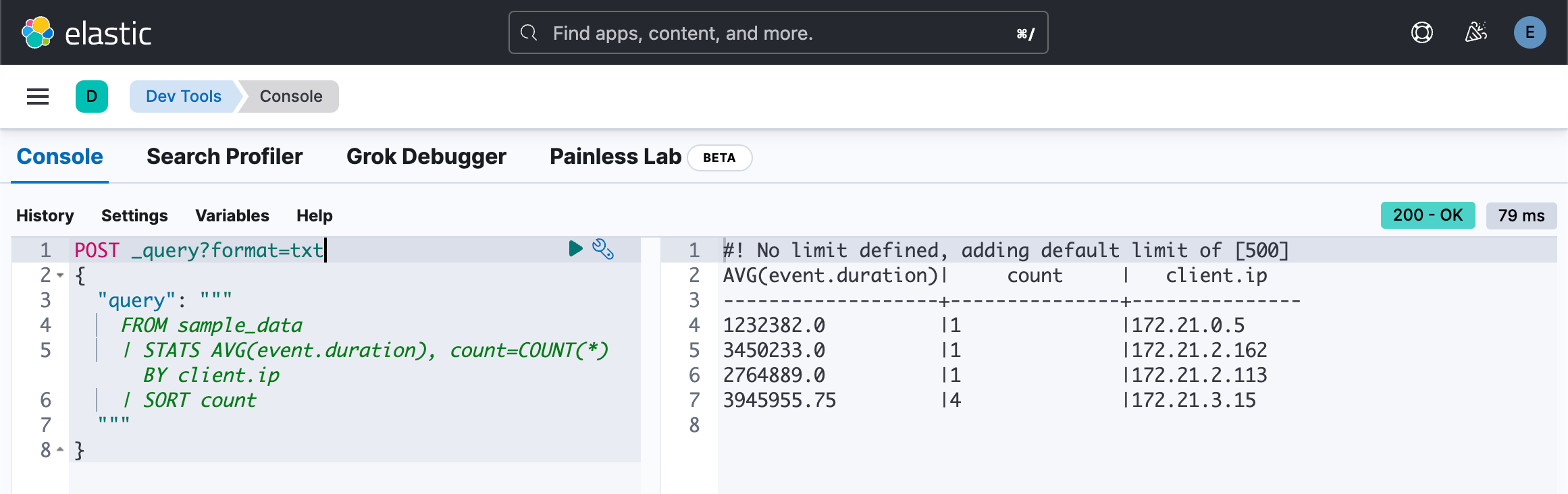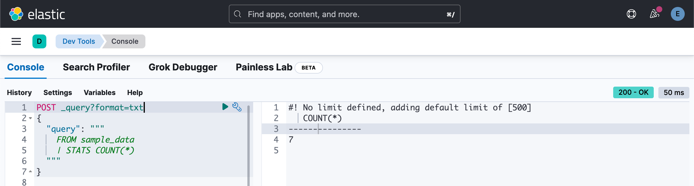 为了便于阅读,本文档将每个处理命令放在一个新行中。 但是,你可以将 ES|QL 查询编写为一行。 以下查询与前一个查询相同: