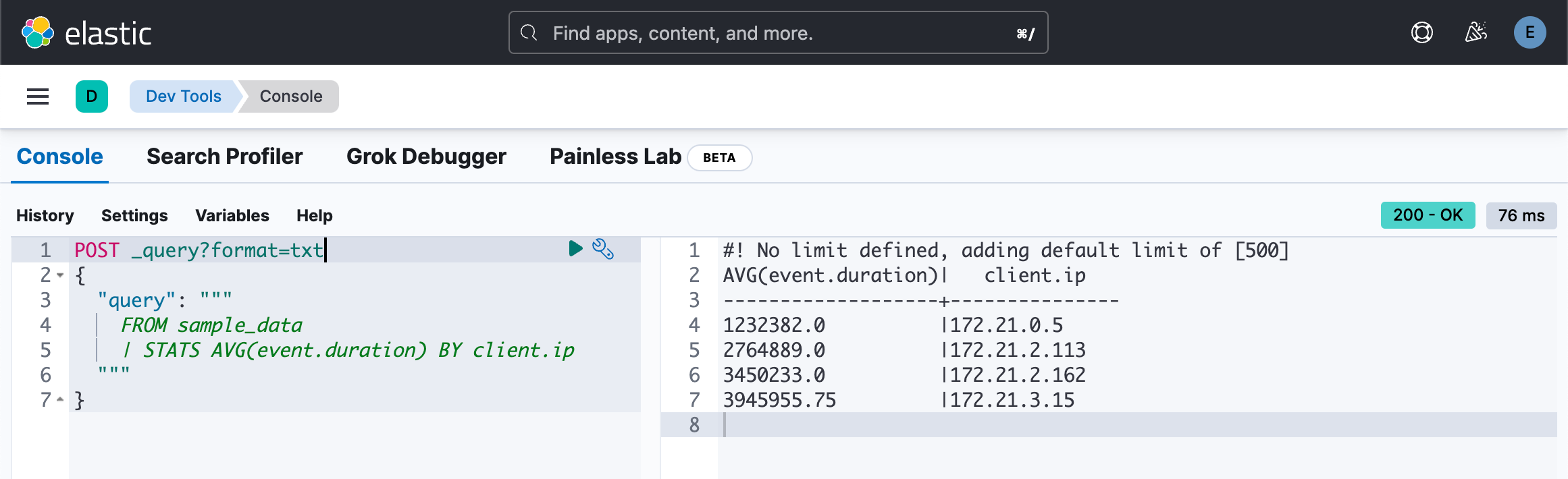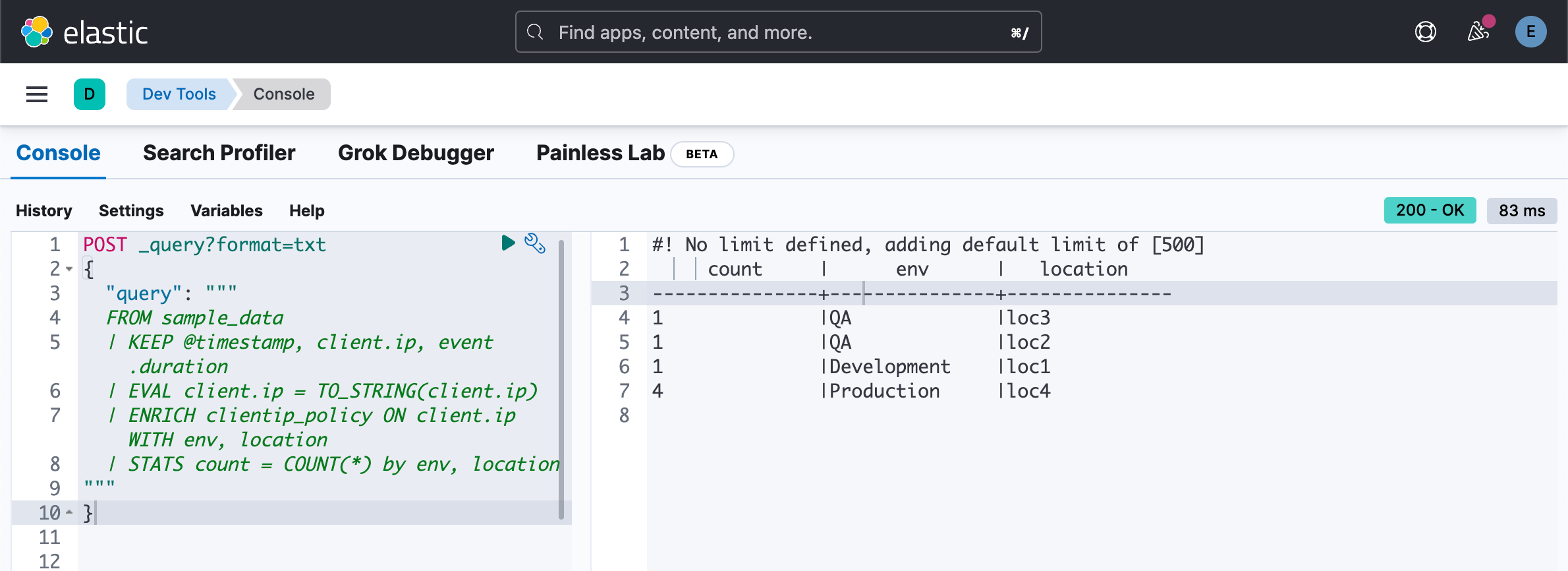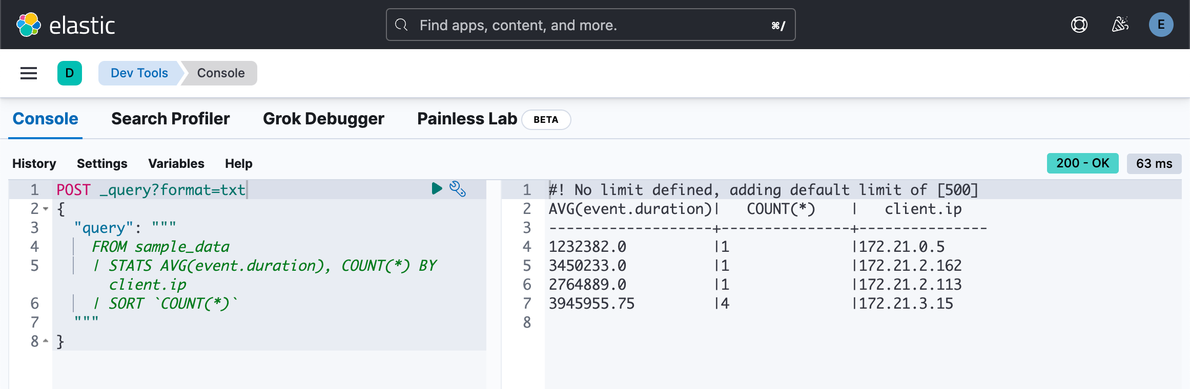 为了便于阅读,本文档将每个处理命令放在一个新行中。 但是,你可以将 ES|QL 查询编写为一行。 以下查询与前一个查询相同: