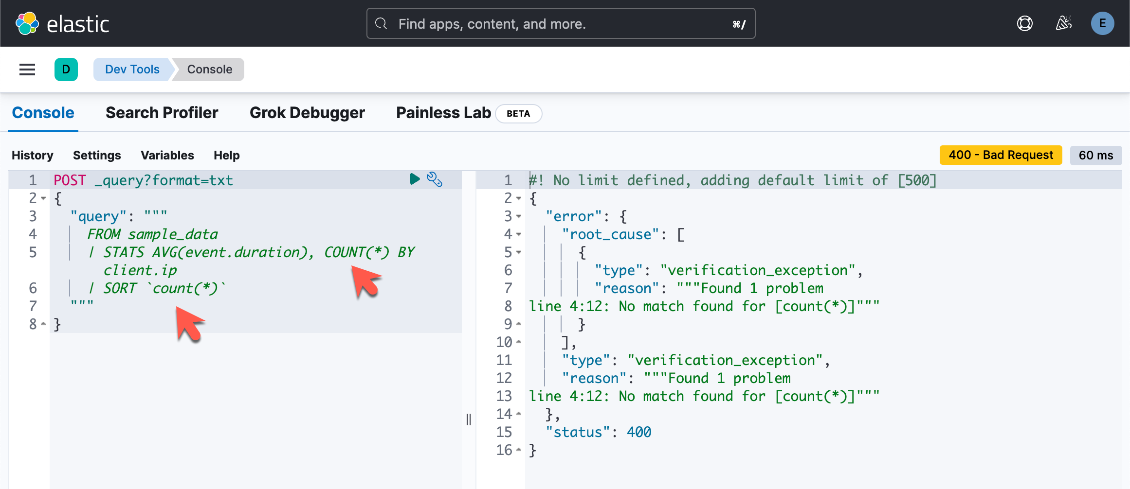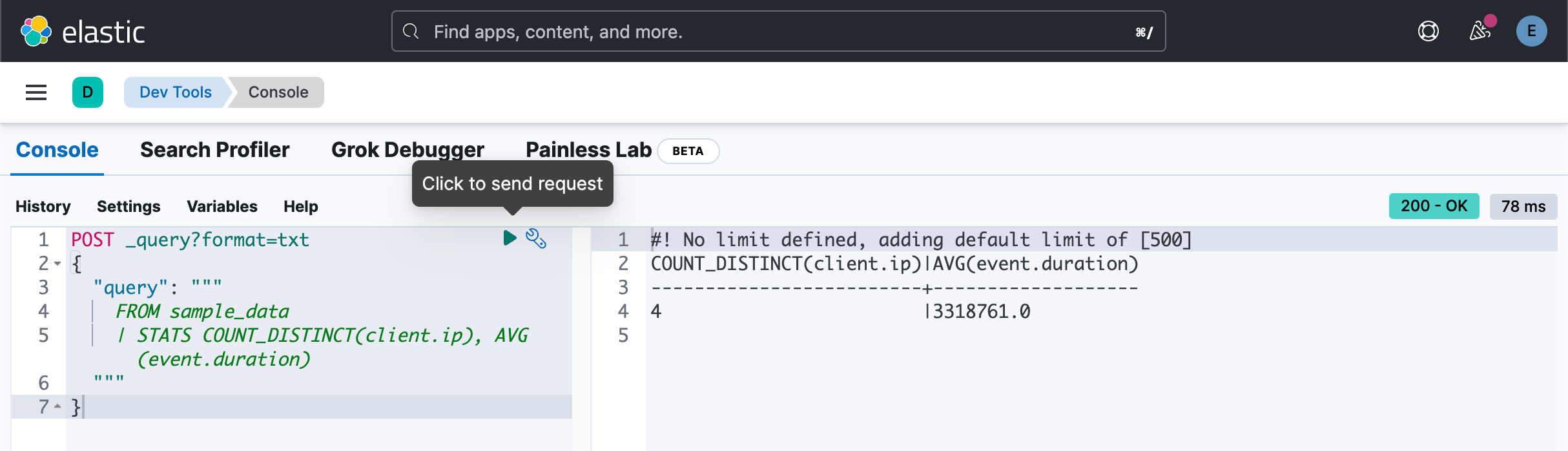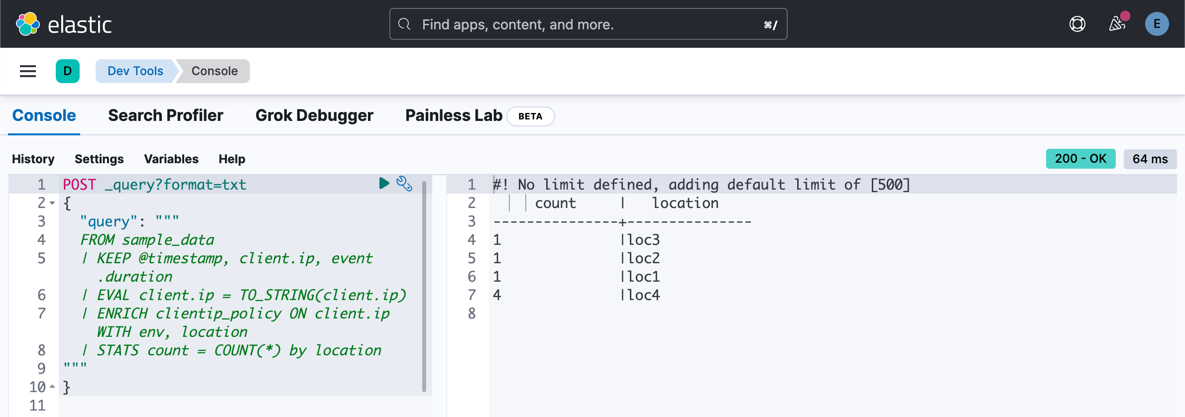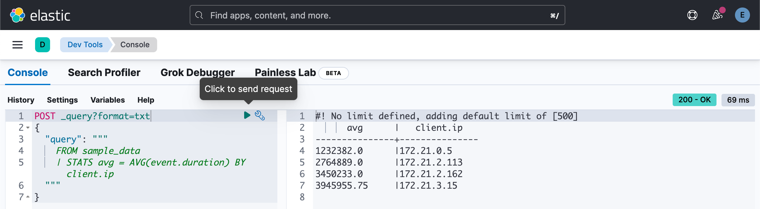 为了便于阅读,本文档将每个处理命令放在一个新行中。 但是,你可以将 ES|QL 查询编写为一行。 以下查询与前一个查询相同: