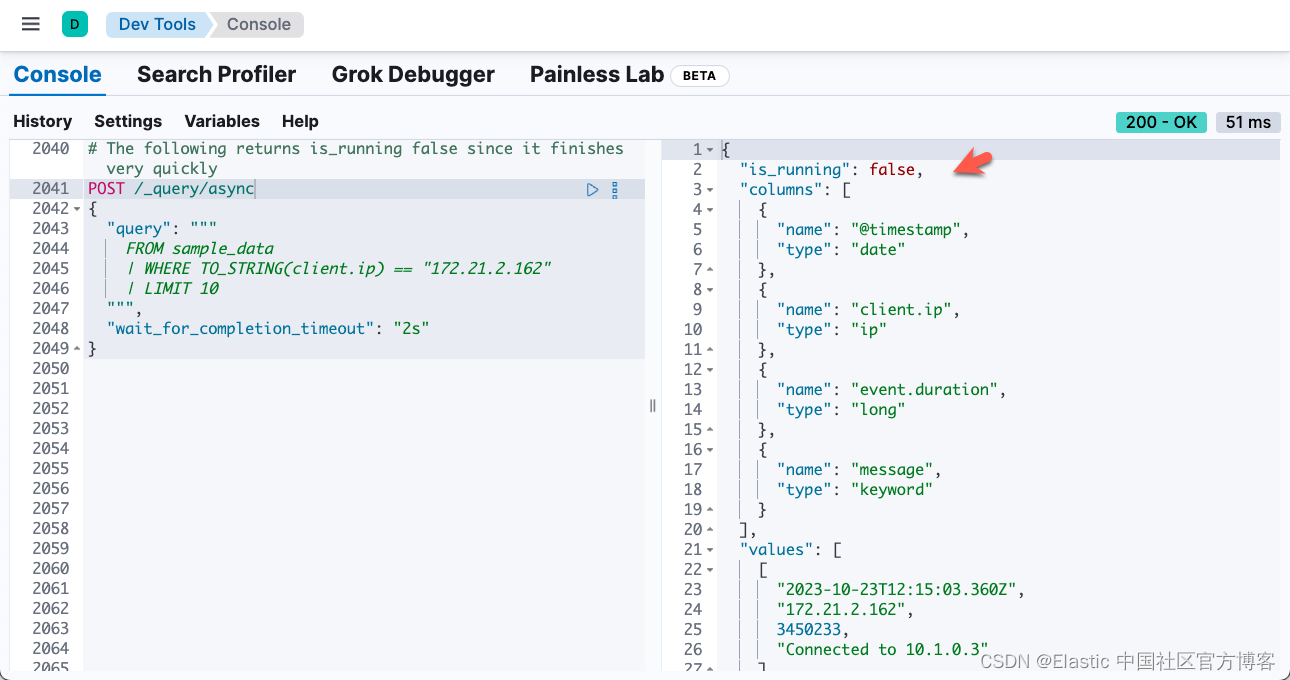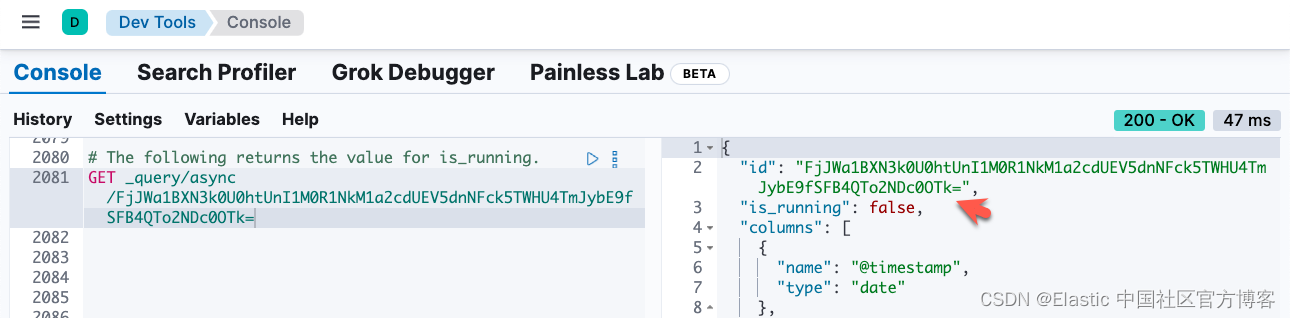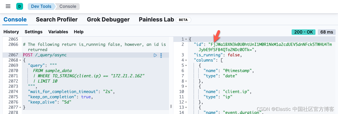 | wait_for_completion_timeout | (可选,时间值)等待请求完成的超时时长。默认为 1 秒,表示请求等待 1 秒以获取查询结果。 如果查询在此期间完成,则将返回结果。否则,将返回查询 id,稍后可用于检索结果。 如果请求在此期间未完成,则返回查询 id (如下)。 |
