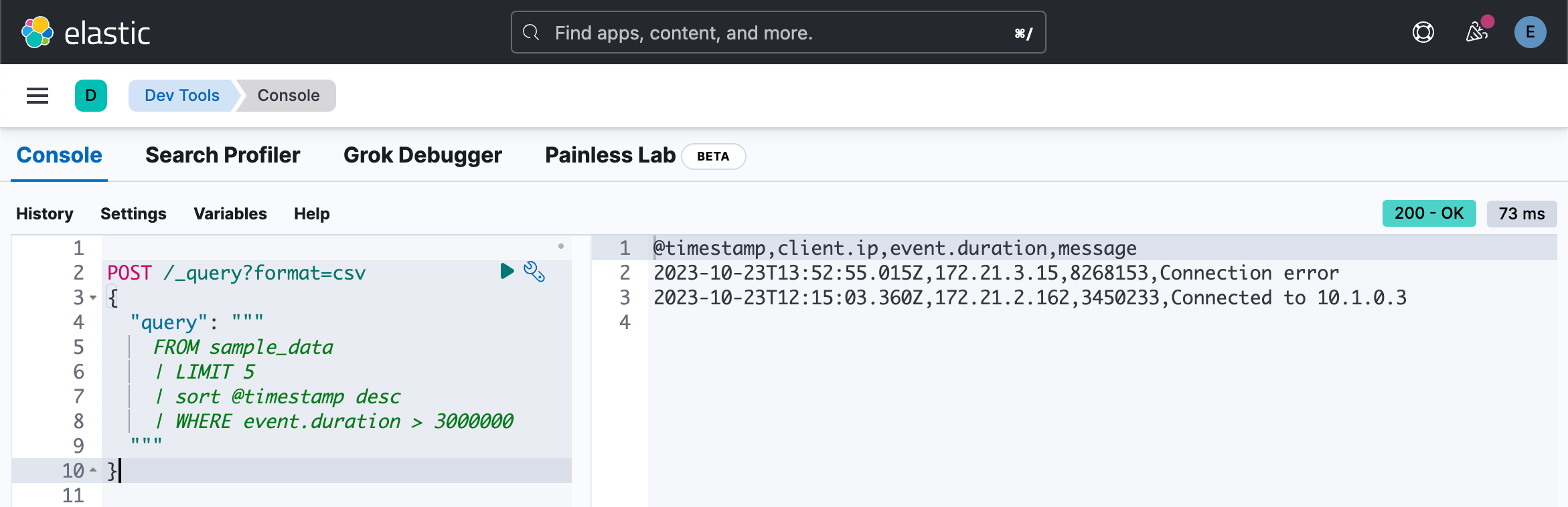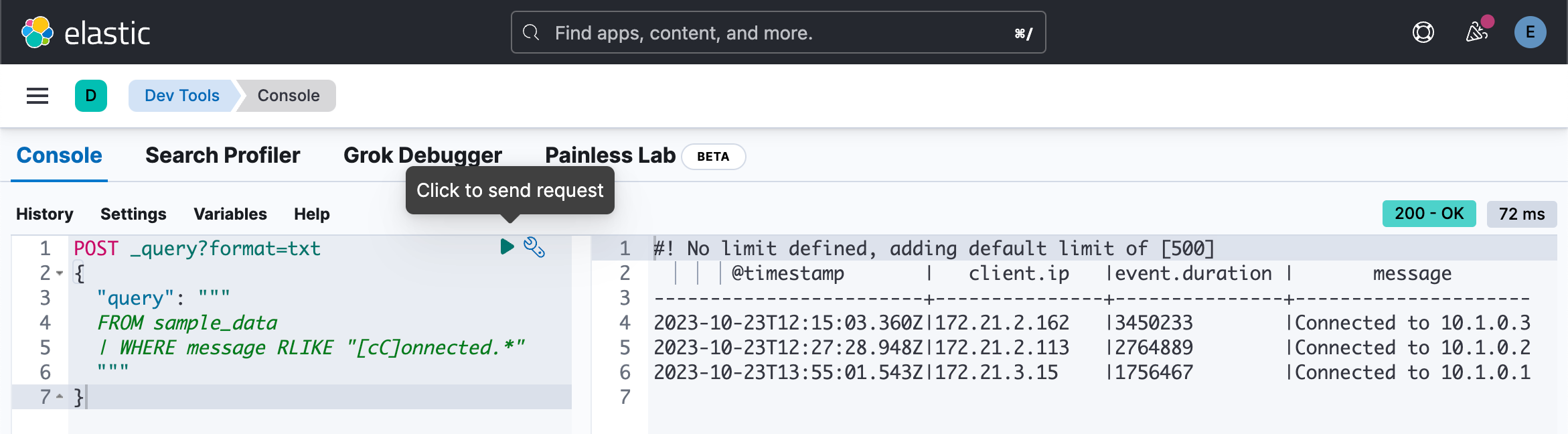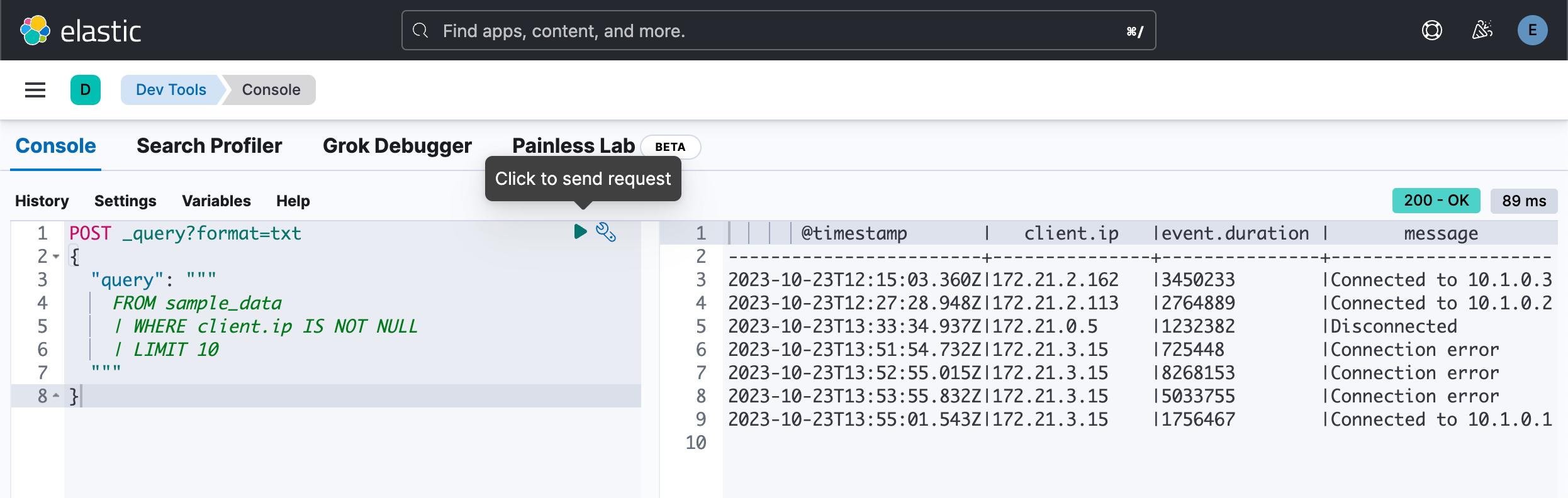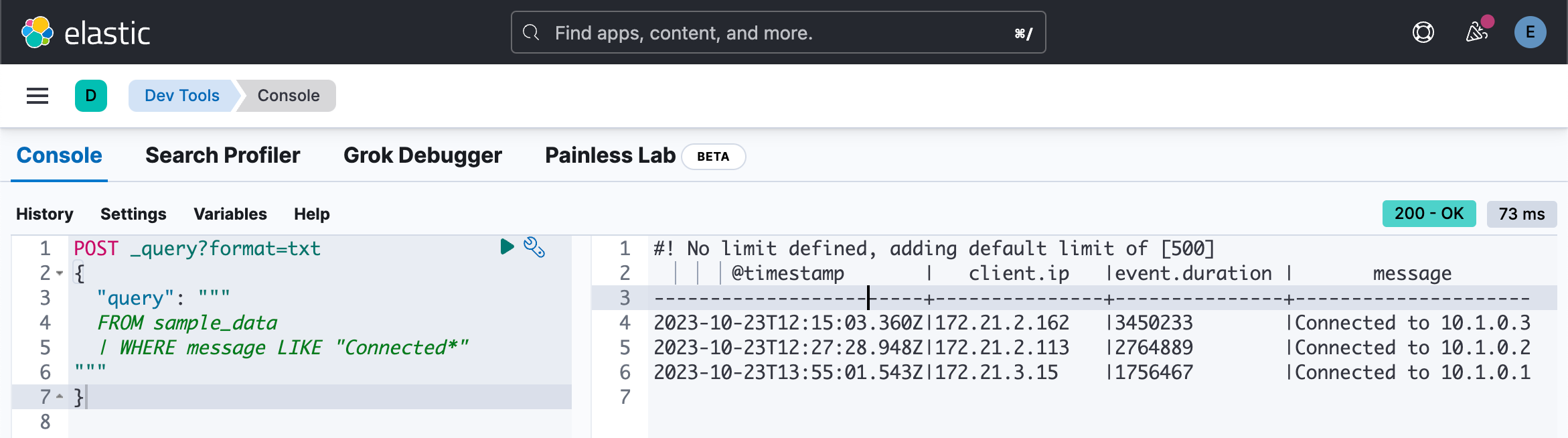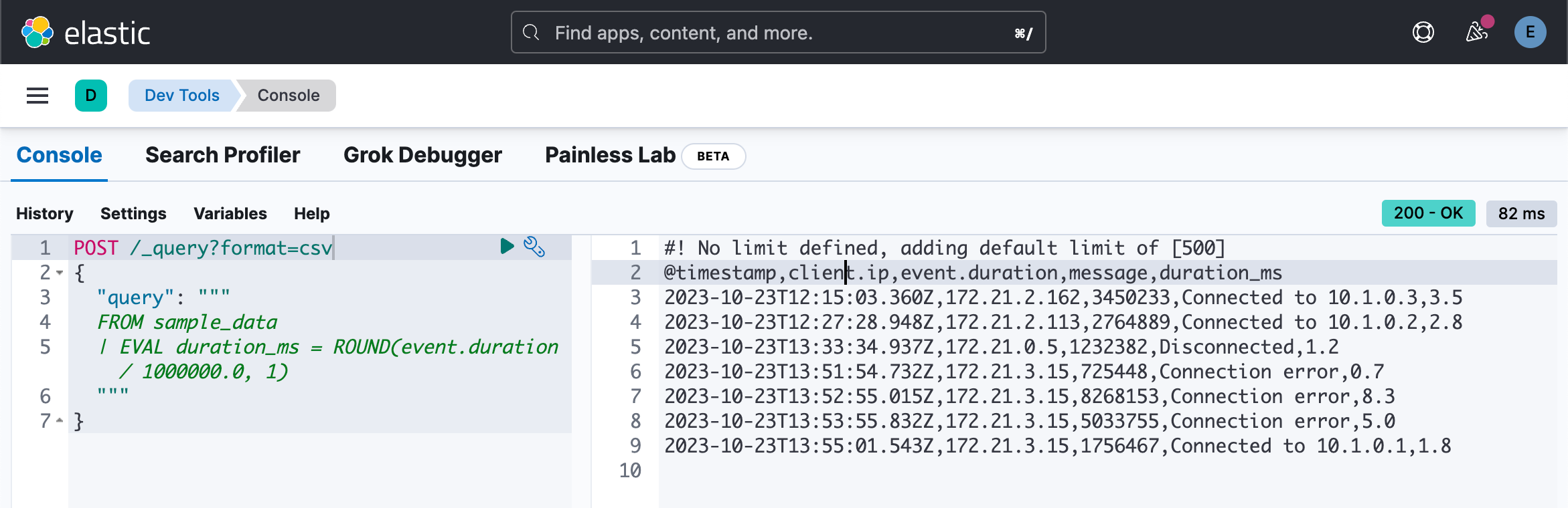 {"@timestamp": "2023-10-23T12:15:03.360Z", "client.ip": "172.21.2.162", "message": "Connected to 10.1.0.3", "event.duration": 3450233}