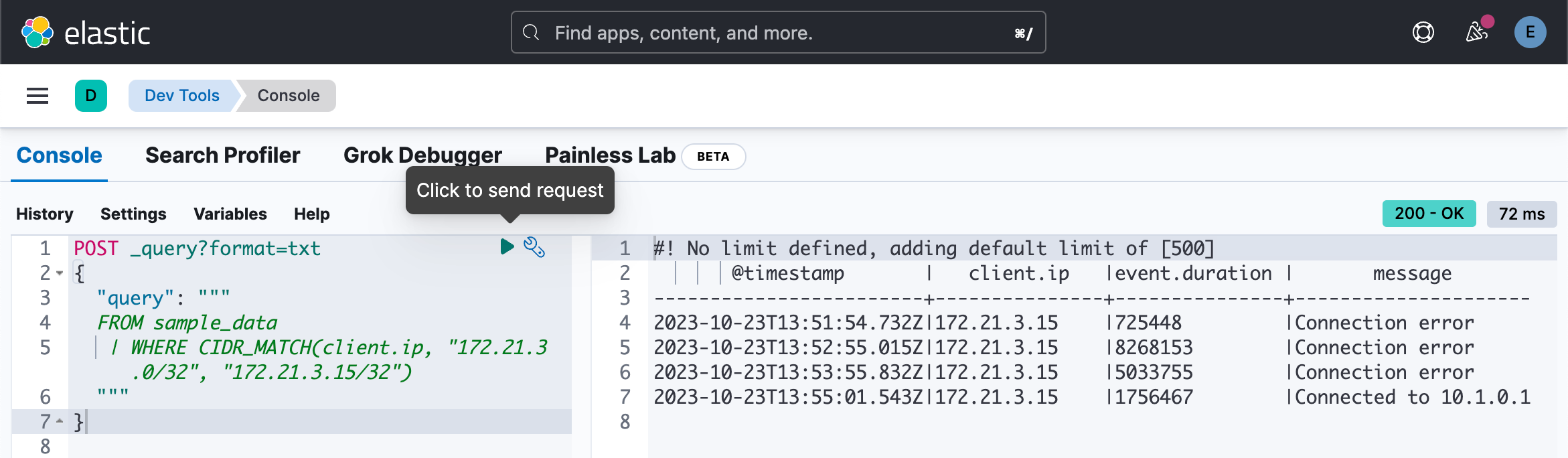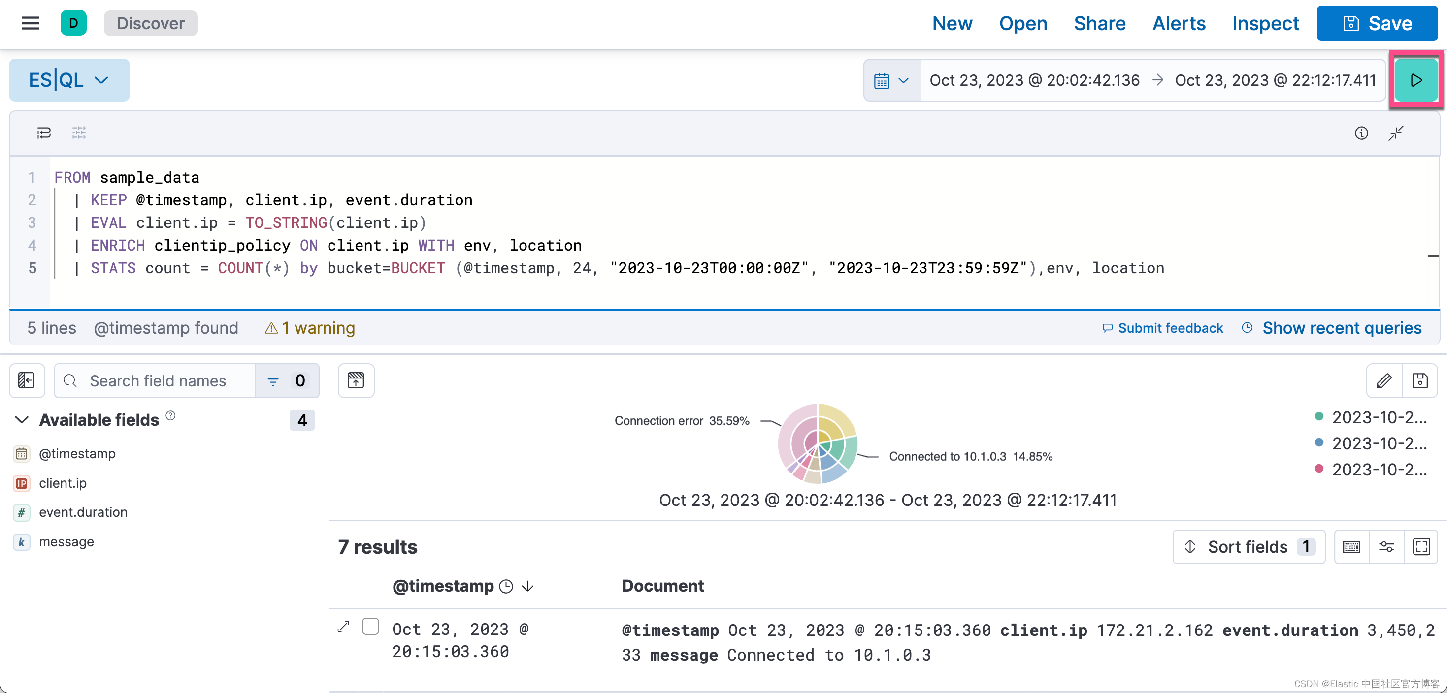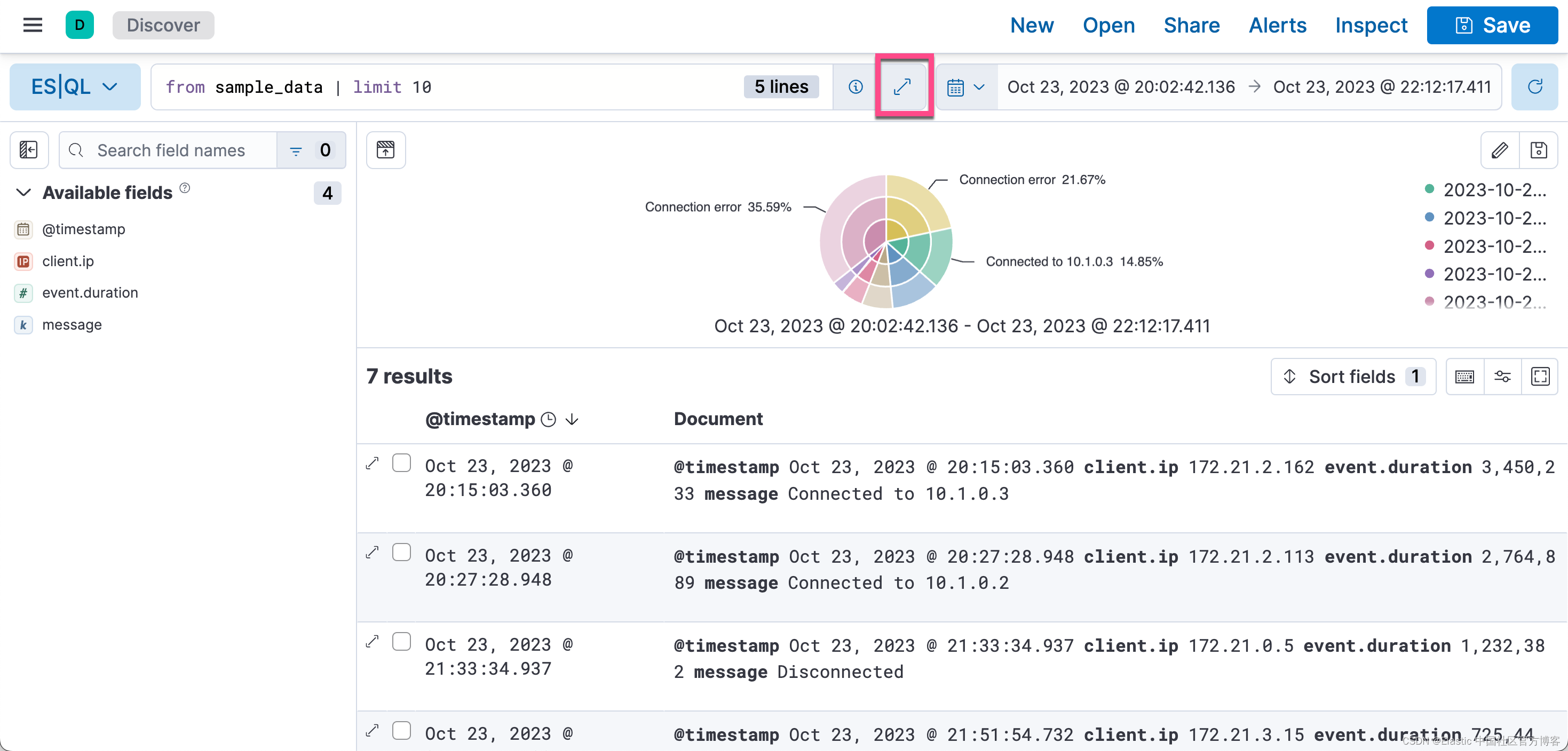 {"@timestamp": "2023-10-23T13:53:55.832Z", "client.ip": "172.21.3.15", "message": "Connection error", "event.duration": 5033755}