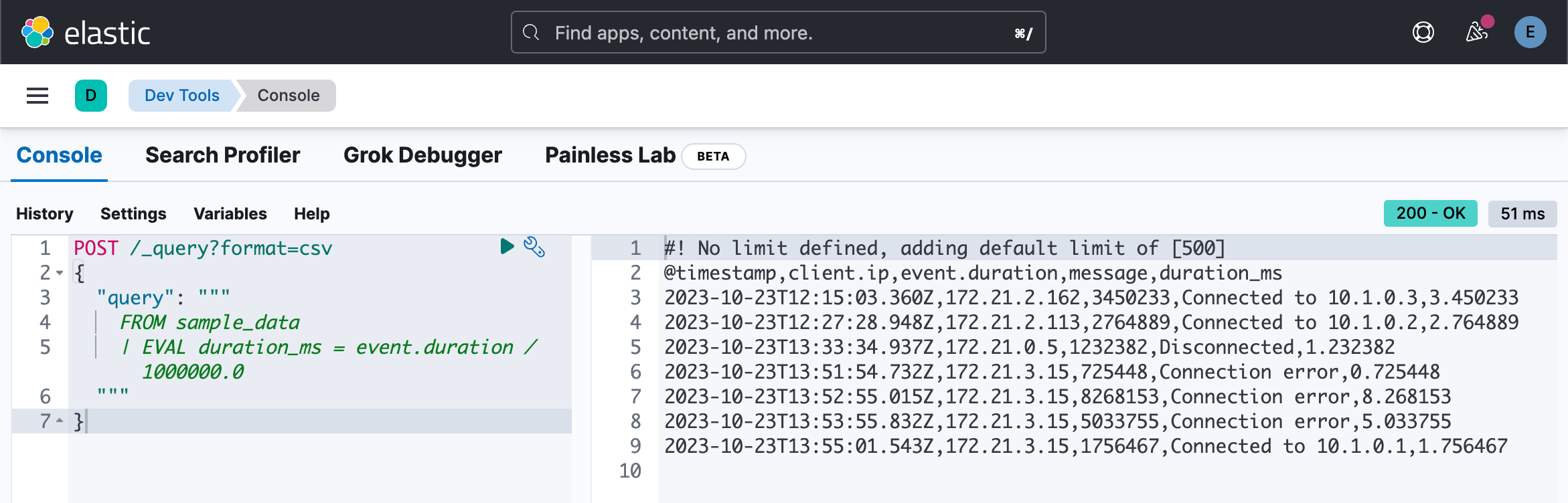 {"@timestamp": "2023-10-23T13:51:54.732Z", "client.ip": "172.21.3.15", "message": "Connection error", "event.duration": 725448}