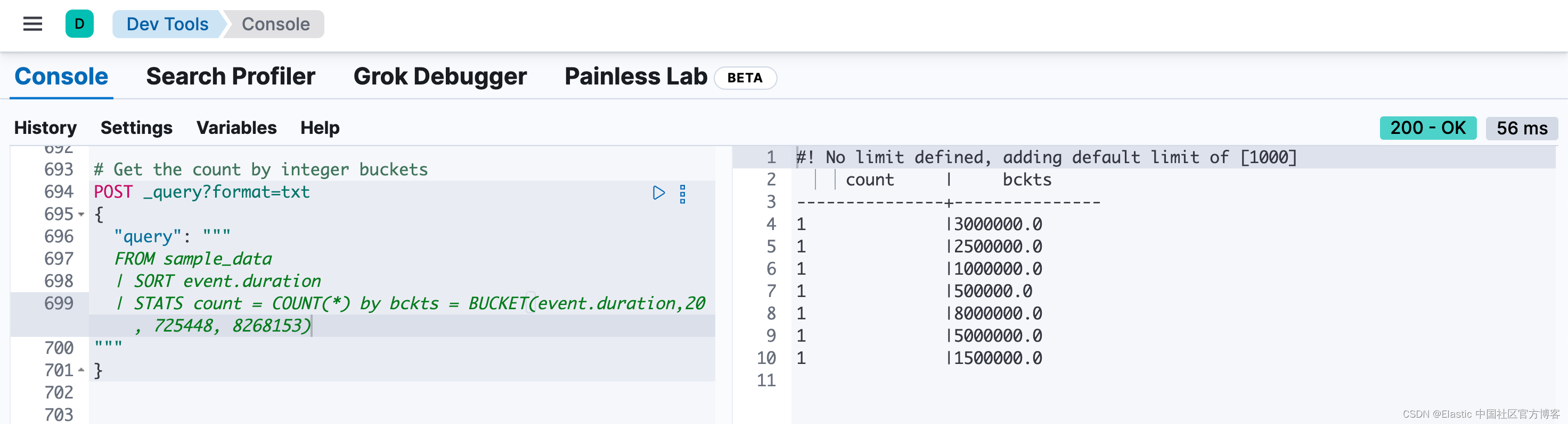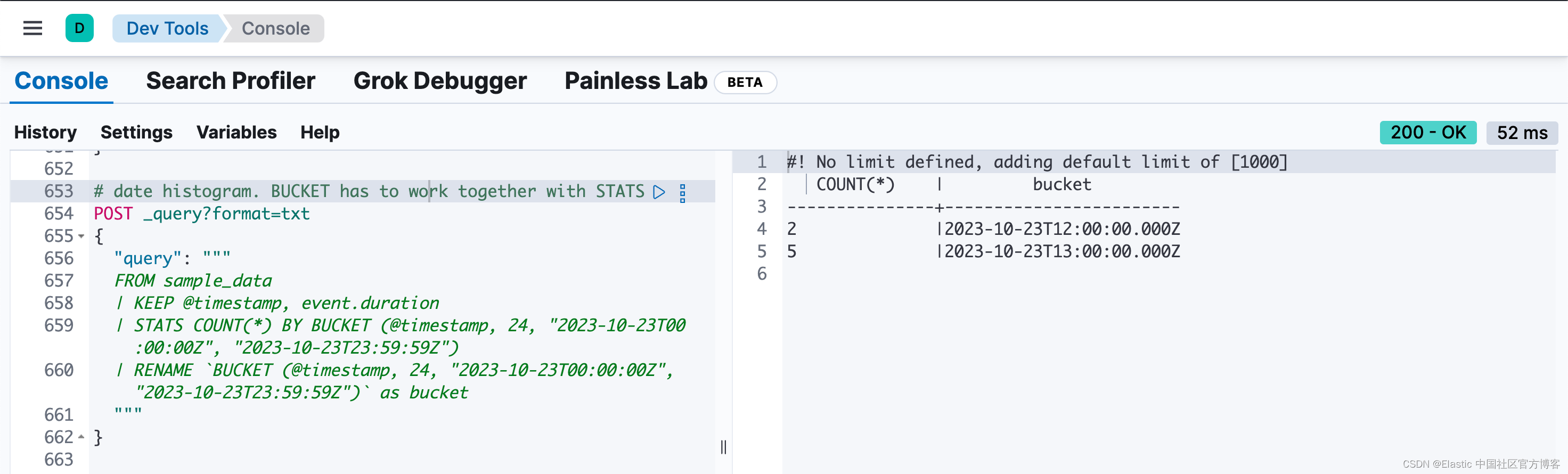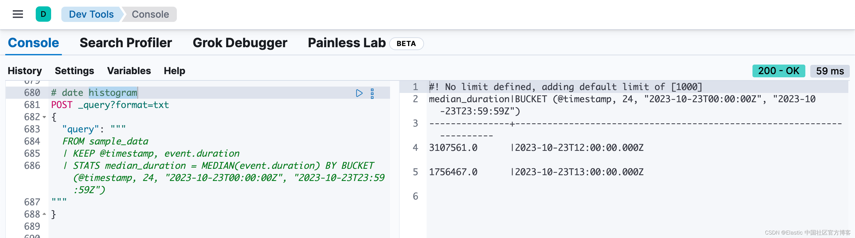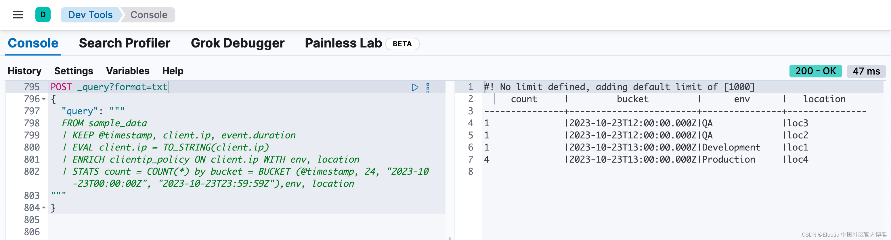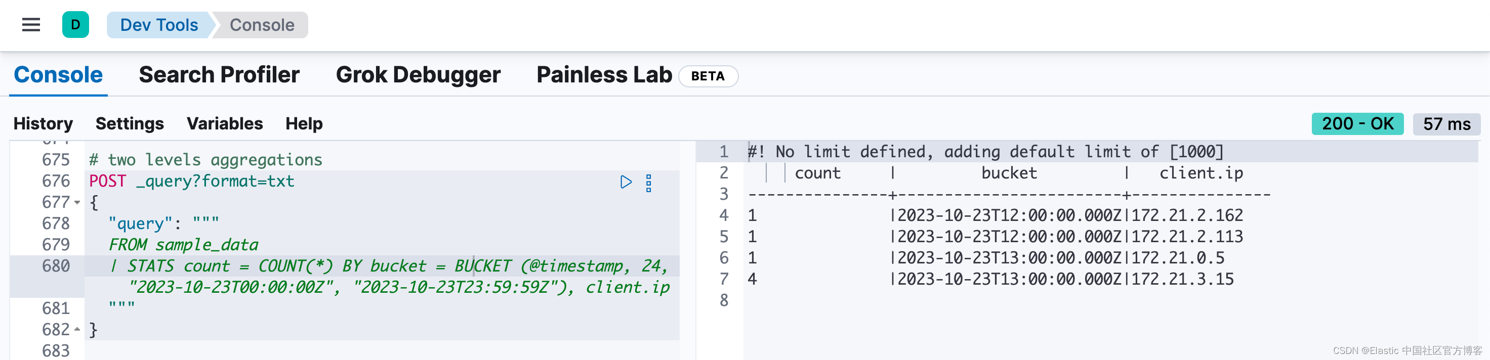 这篇文章是继我昨天完成的文章 “Elasticsearch:ES|QL 函数及操作符” 的另外一篇文章。我将继续使用之前文章 “Elasticsearch:ES|QL 快速入门” 中的例子来结合 ES|QL 函数来做更进一步的展示。希望能对之前的文章做一个更进一步的展示。在这里,我将主要使用 Dev Tools 来进行展示。