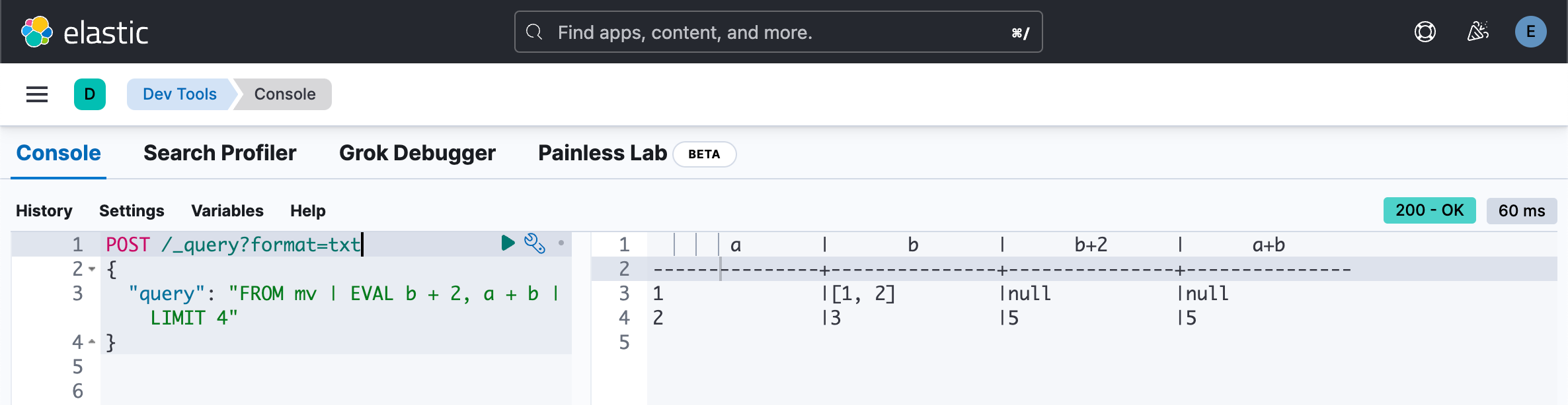 "query": "FROM mv | EVAL b + 2, a + b | LIMIT 4"