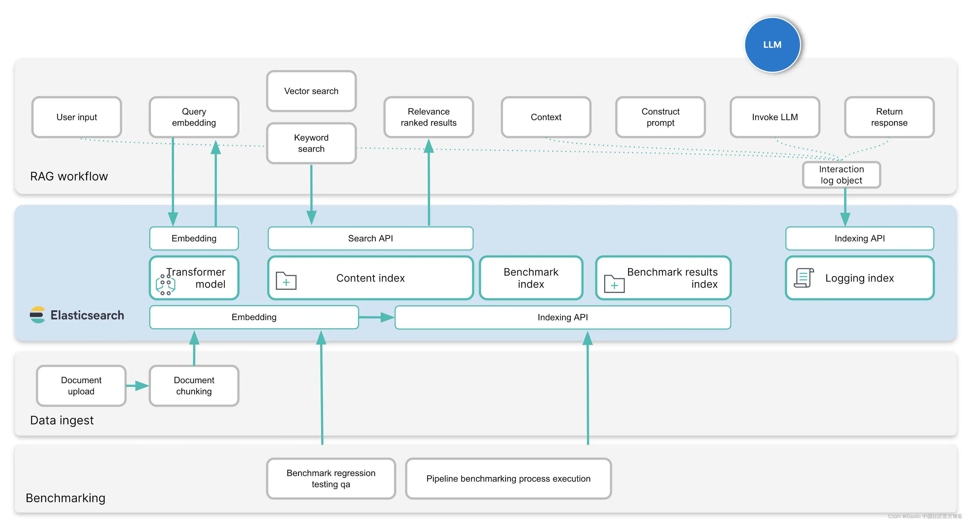 - Elastic 可以用作基准测试设置数据的内容存储,包括问题、答案和基本事实 - 允许使用与 RAG 管道相同的库来实现评估框架,从而进一步降低复杂性并确保测试框架与应用程序实现保持一致。