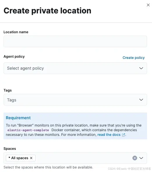 填写字段并为这个 Private Location 创建一个新策略。重要的是要知道 Private Location 应该基于运行在单个 Elastic Agent 上的代理策略进行设置。