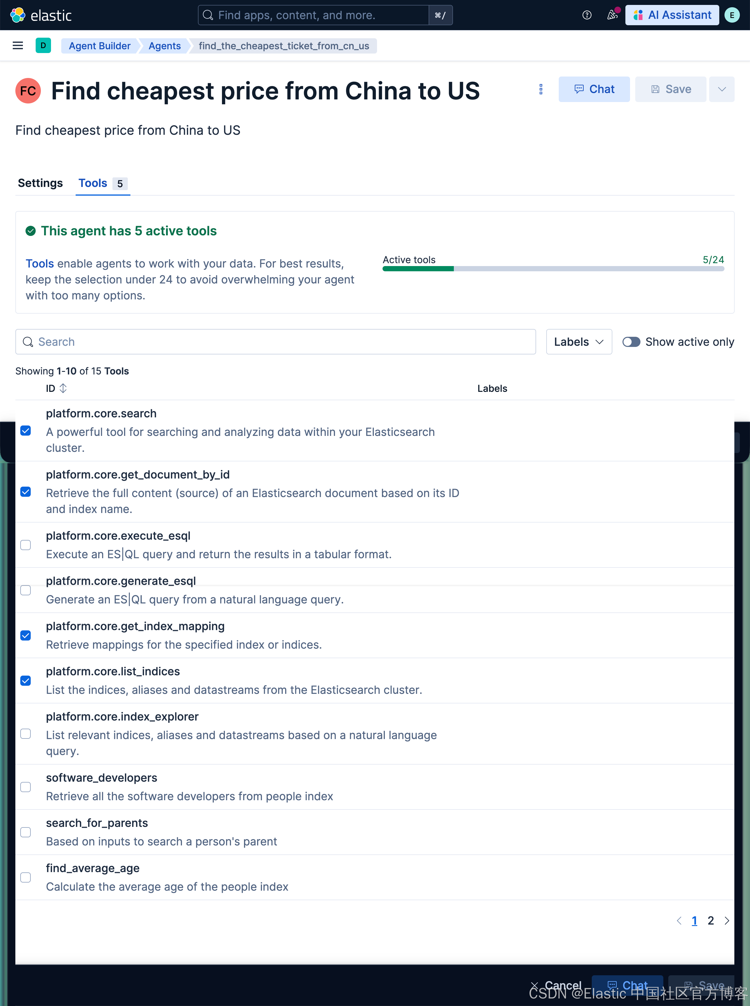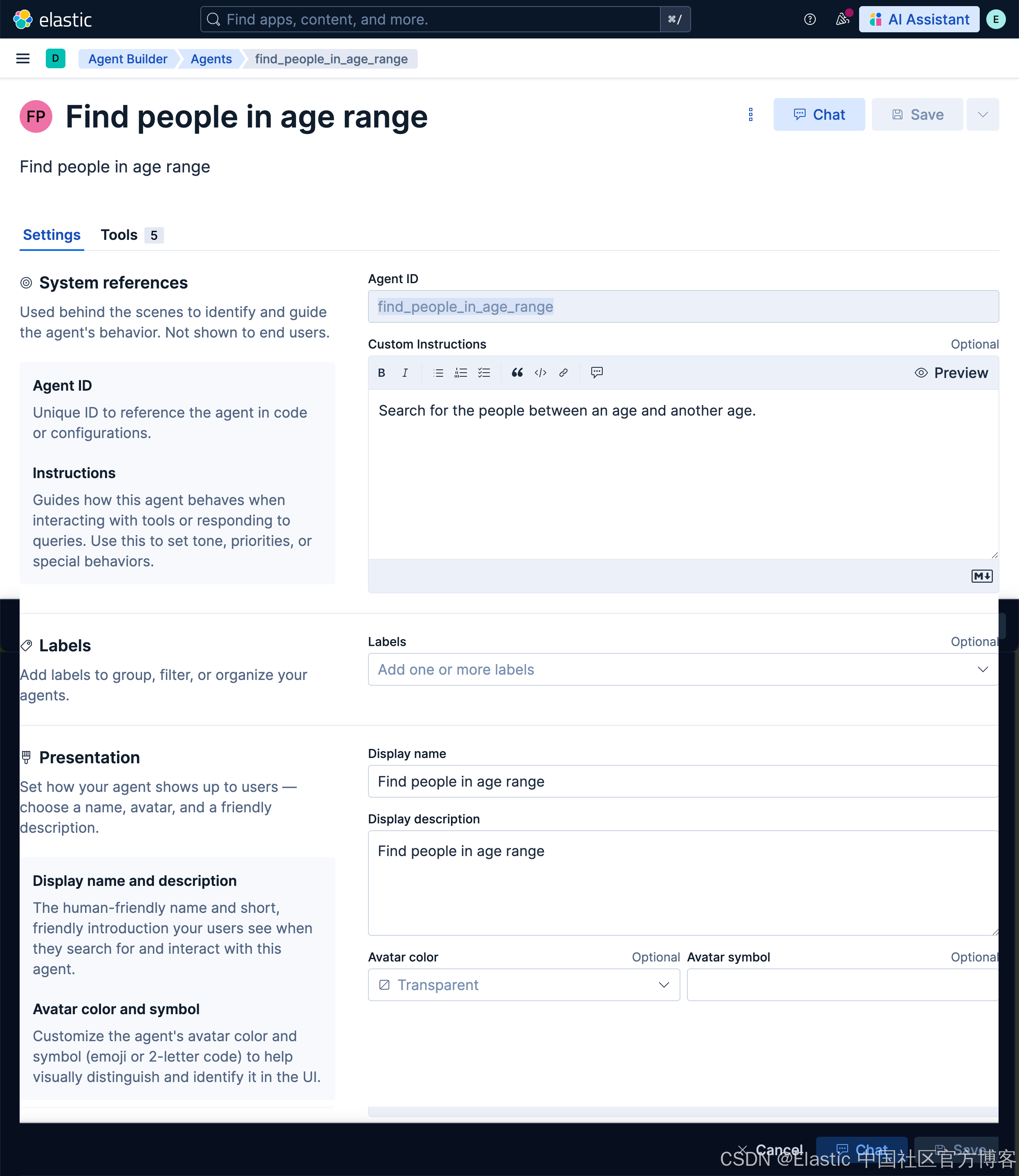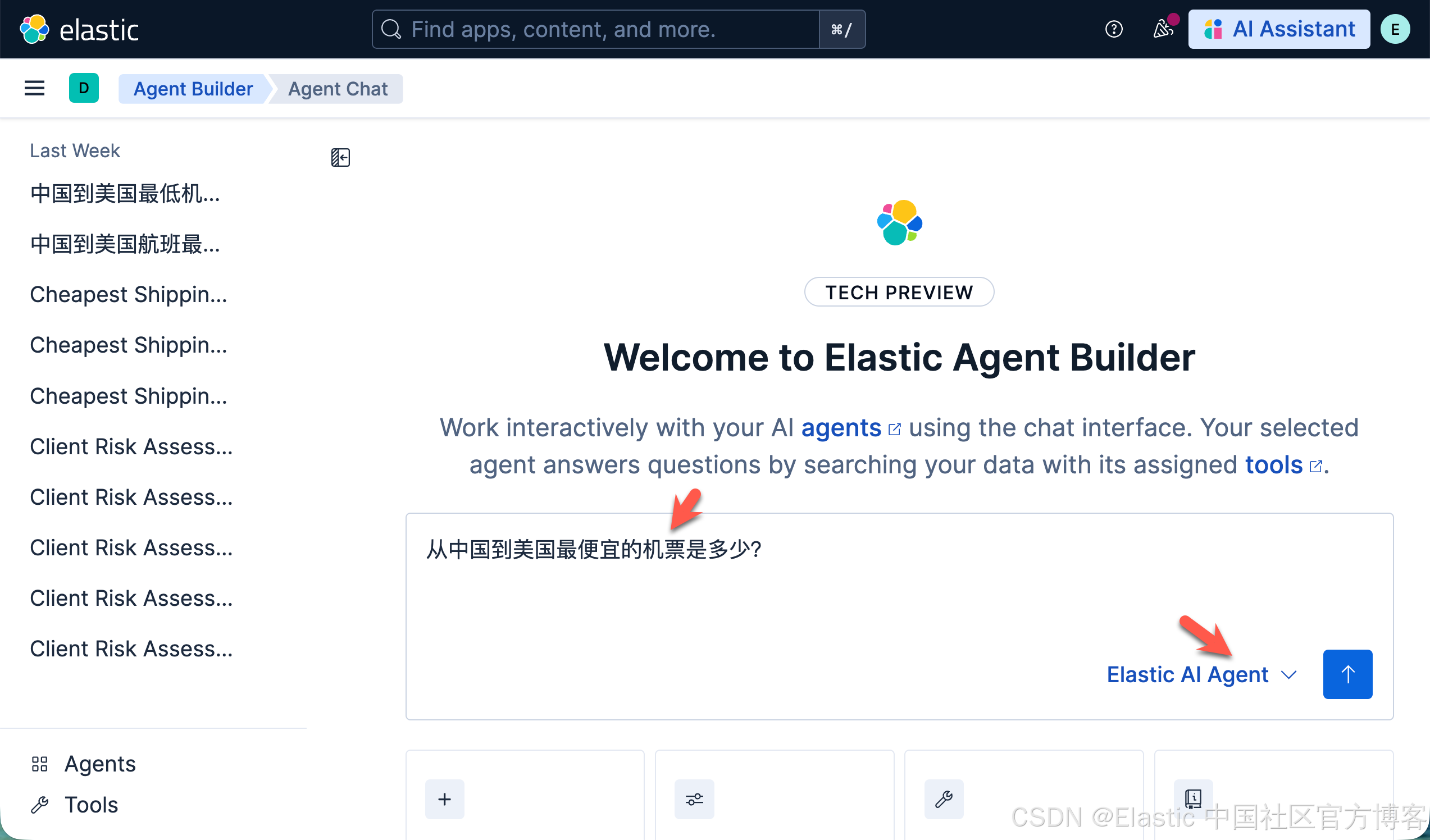 Elastic Agent Builder 包含一个默认 Agent(名为 Elastic AI Agent),它可以访问所有内置工具。你也可以创建具有自定义指令和选定工具的专用 Agents,以应对特定的使用场景或工作流。