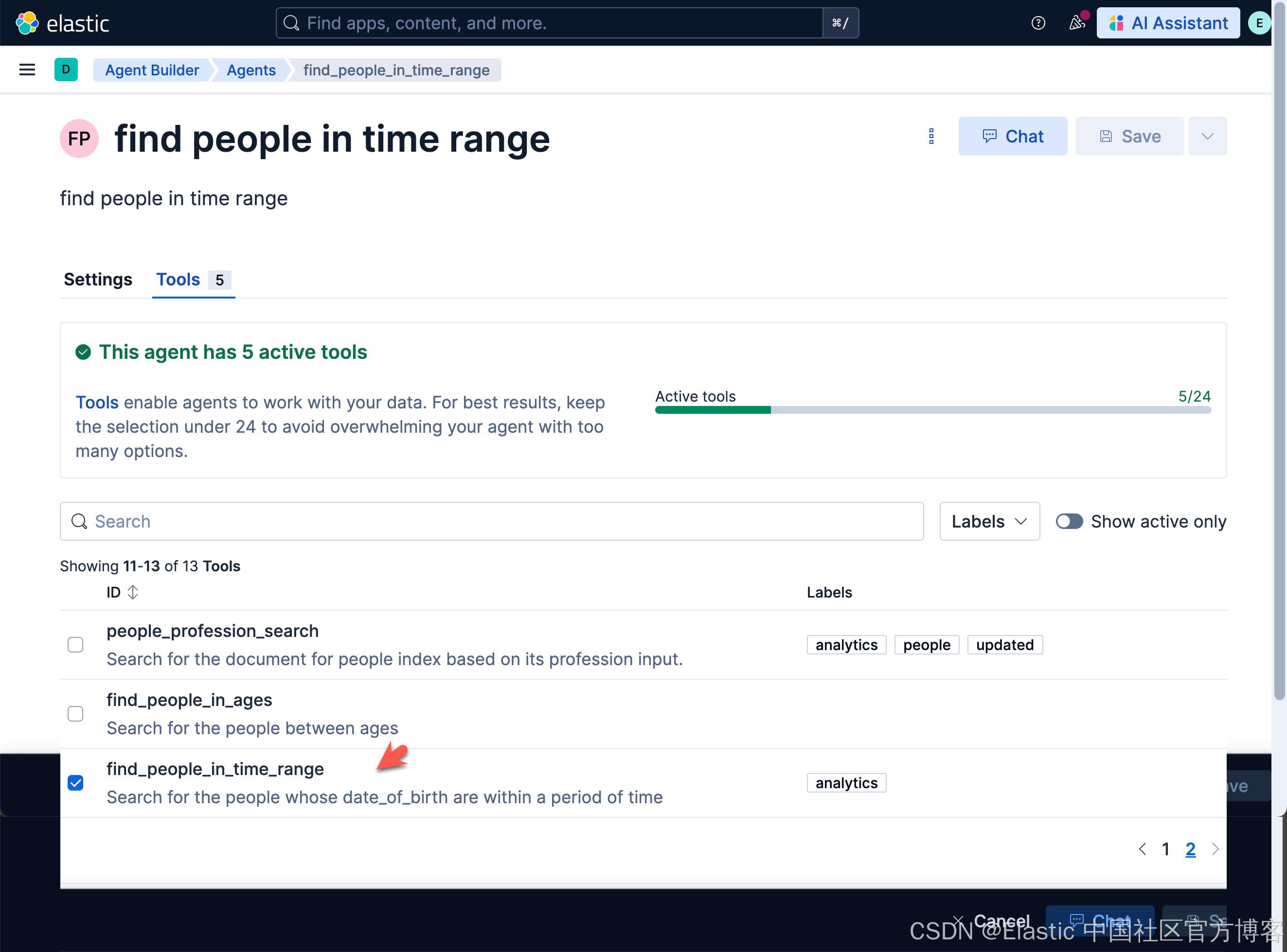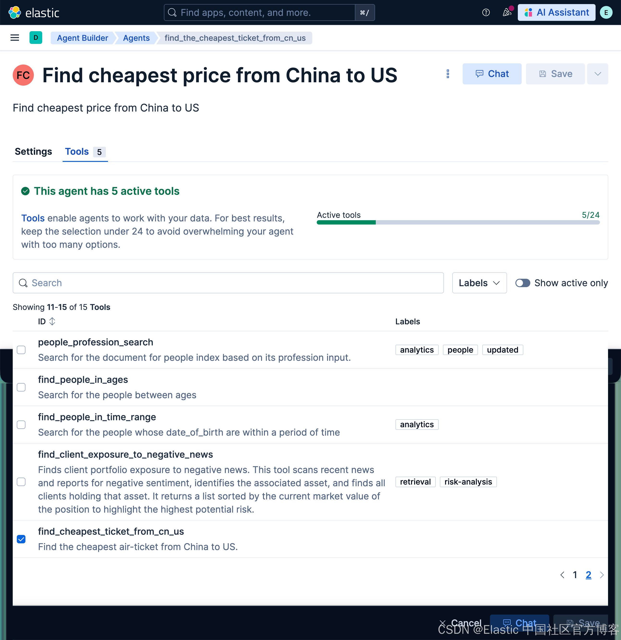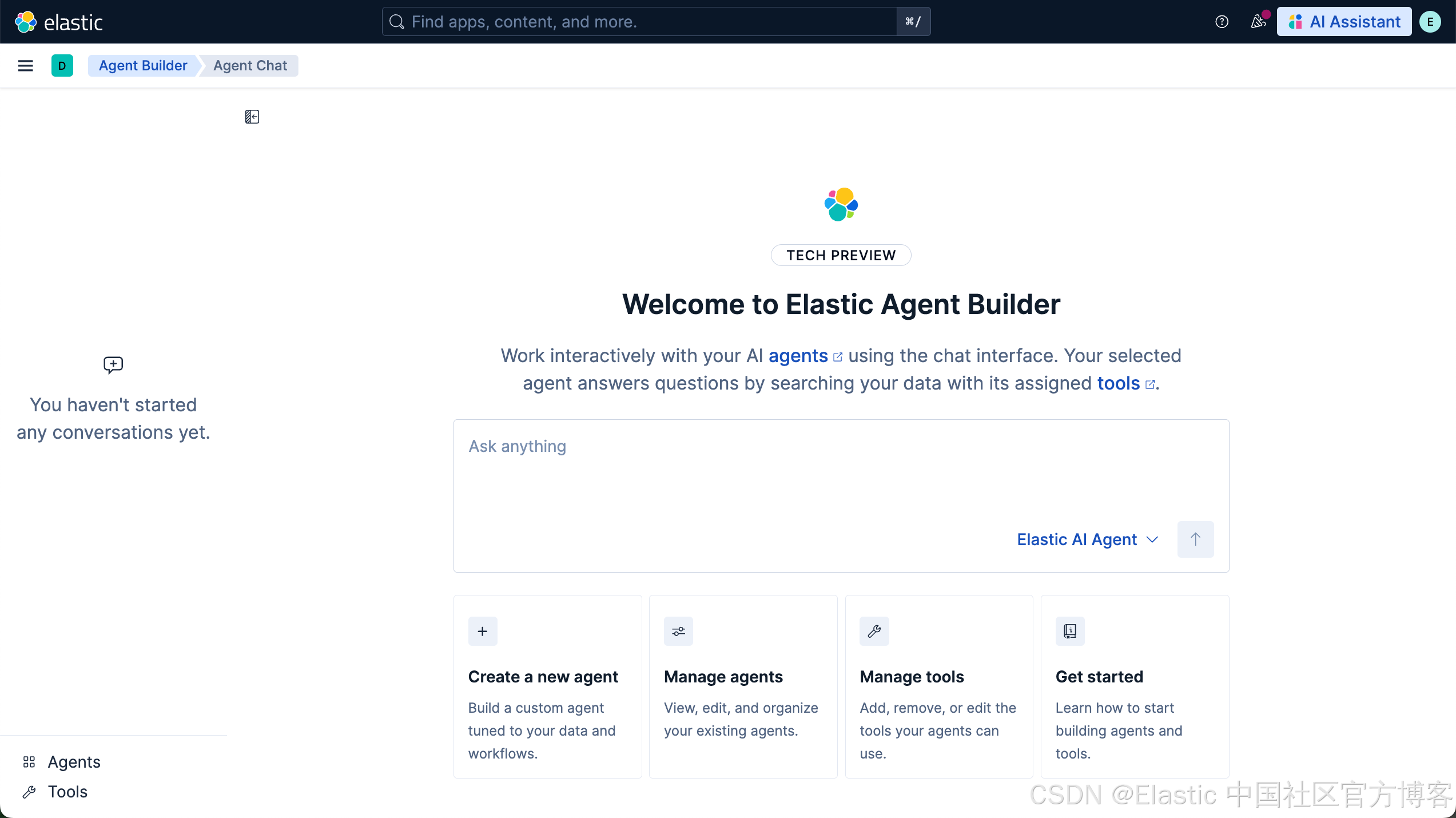 Elastic Agent Builder 包含一个默认 Agent(名为 Elastic AI Agent),它可以访问所有内置工具。你也可以创建具有自定义指令和选定工具的专用 Agents,以应对特定的使用场景或工作流。