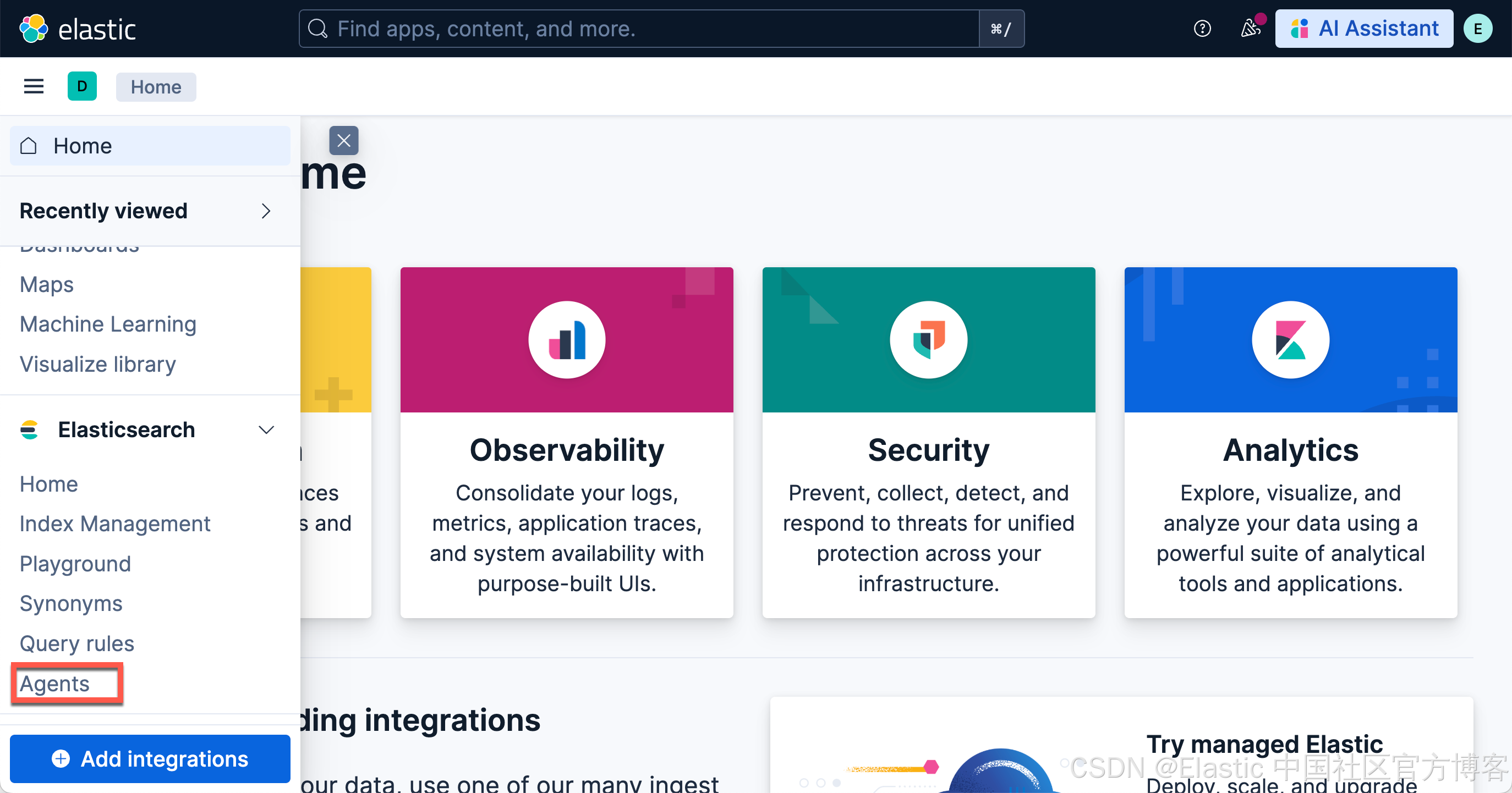 在最新的 Elastic Stack 9.2 开始,我们必须运行上面的两个命令,才能看到如下的 Agents 菜单: