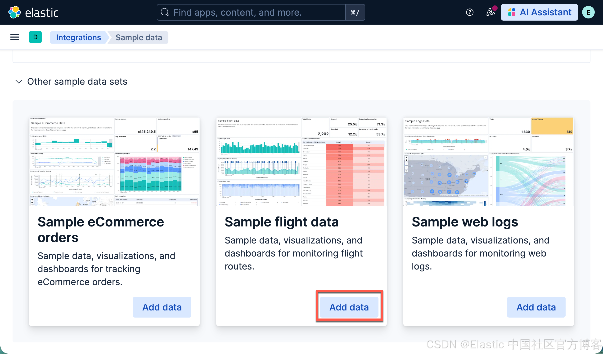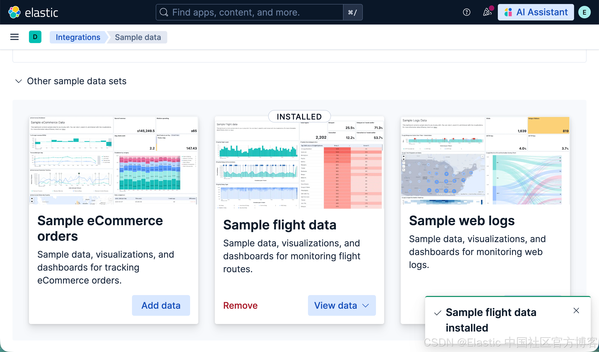 针对本地安装的 Elastic Stack 9.2+ 的开发者,我们可以通过如下的方式来加载 flights 数据集(在 Serverless 上没有这个数据集):