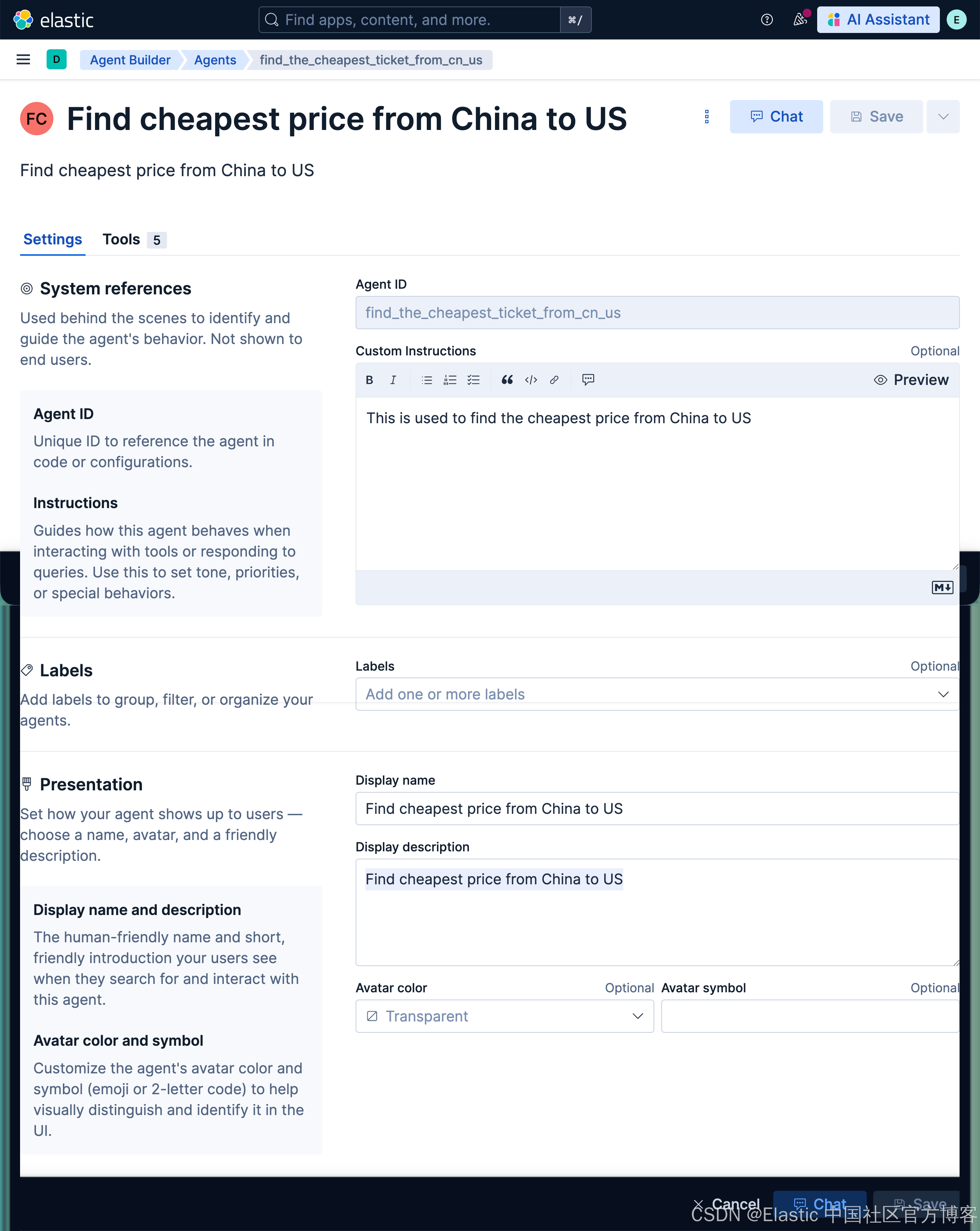 注意:默认的 Elastic AI Agent 是不可变的,不能被编辑。若要自定义 Agent 的行为,你需要通过克隆默认 Agent 或从零创建一个新的 Agent 来实现。