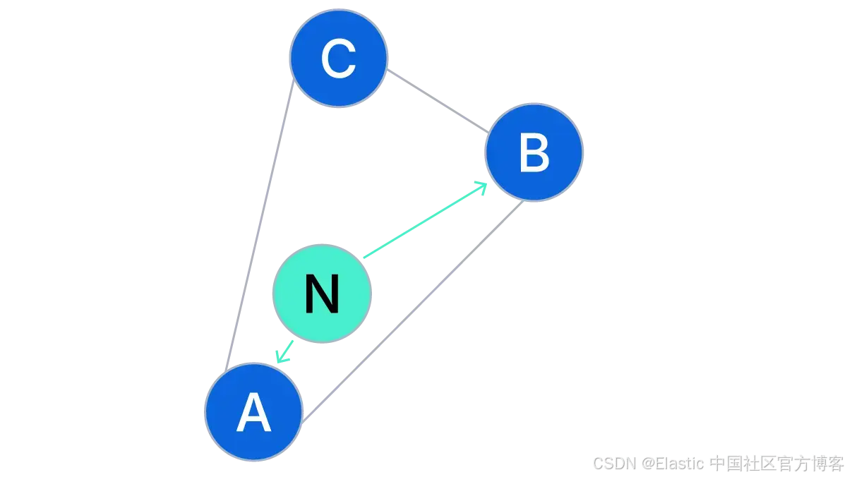 节点 N 正在被添加到图中。新连接将从 N 到 A 和 B 建立,因为它们是最近的节点,但不会连接到 C,因为 C 离 B 比离 N 更近。然后,还会建立从 N 的新连接邻居回到 N 的入向连接(incoming connections)。这些连接同样考虑多样性,相对于现有节点,如果该节点的连接数达到上限,会移除现有连接以维持多样性。这确保了节点与多样化的其他节点相连,最大化它们从图中其他位置的可达性,并最小化完全连接团的形成。