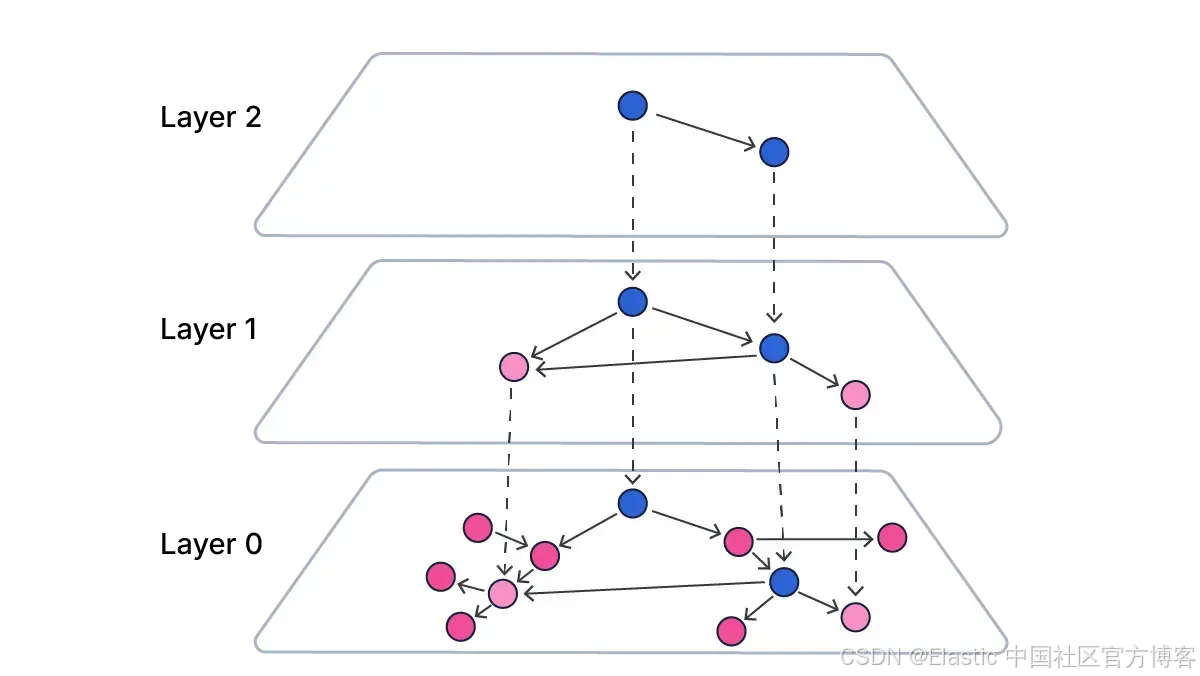 每一层的每个节点都有指向该层某些其他节点的引用,通常是最接近的节点(由向量相似度决定,见下文)。