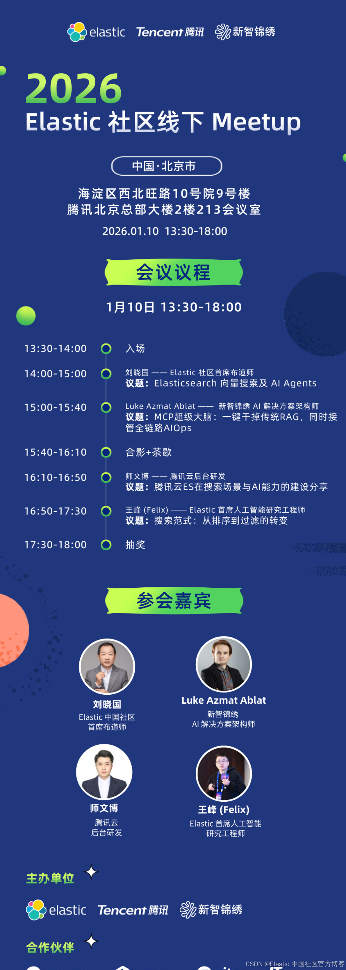 2026 Elastic Meetup 北京站活动,由 Elastic、腾讯、新智锦绣联合举办,现诚邀广大技术爱好者及开发者参加。这将是 Elastic 在新的一年里的第一次线下 Meetup。欢迎广大开发者前来参加!