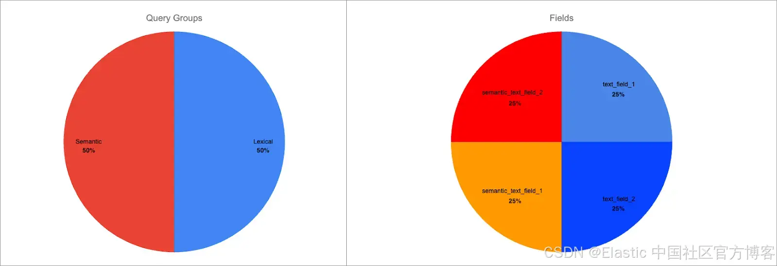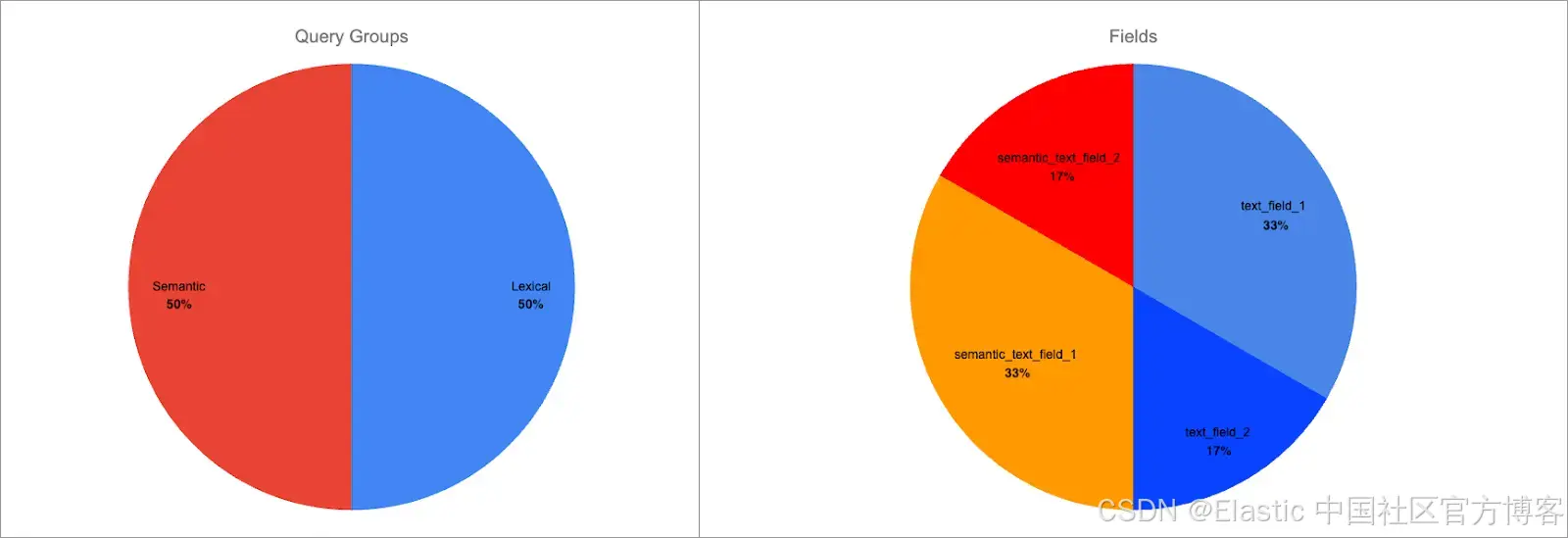 这可能不是你想要的,因为它会造成分数不平衡。在像这个只有 3 个字段的示例中,影响可能不太明显,但当查询更多字段时就会成为问题。例如,大多数索引包含的词汇字段远多于语义字段(即 dense_vector、sparse_vector 或 semantic_text)。如果我们用上面的模式查询一个有 9 个词汇字段和 1 个语义字段的索引呢?词汇匹配将占总分的 90%,削弱语义搜索的效果。