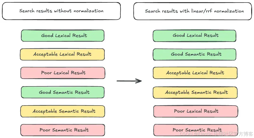 为了铺垫背景,让我们先回顾一下混合搜索之所以困难的主要原因之一:分数范围不同。我们熟悉的 BM25 会产生无上限的分数。换句话说,BM25 可以生成从接近 0 到(理论上)无限大的分数。相比之下,对 dense_vector 字段的查询会产生介于 0 到 1 之间的分数。更让问题复杂的是,semantic_text 会隐藏用于索引 embedding 的字段类型,因此除非你对索引和推理(inference)端点配置非常了解,否则很难知道查询的分数范围。这在尝试交错展示词汇和语义搜索结果时会造成问题,因为词法结果可能会压过语义结果,即使语义结果更相关。解决这个问题的通用方法是在交错结果之前对分数进行归一化。Elasticsearch 为此提供了两个工具:linear 和 RRF 检索器。
