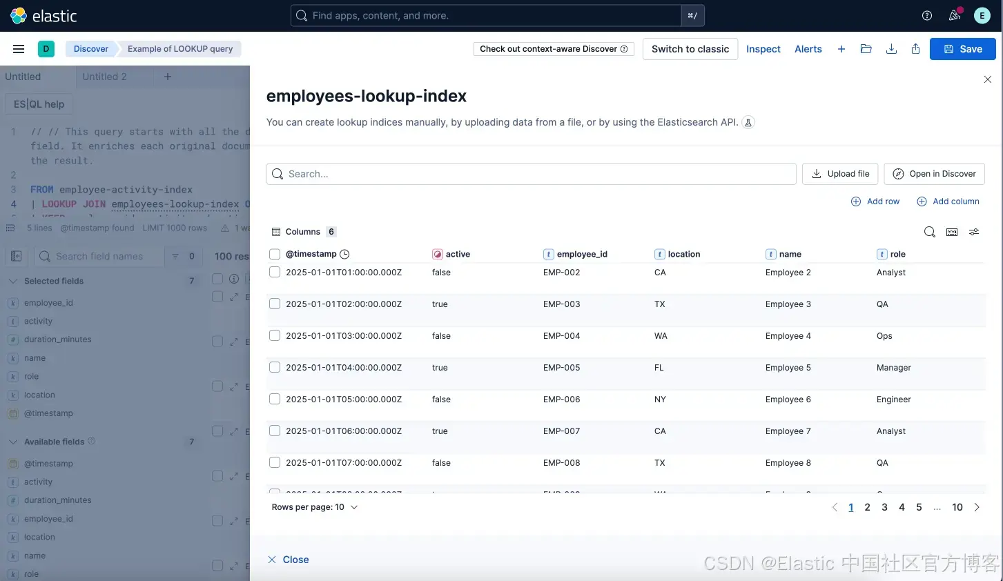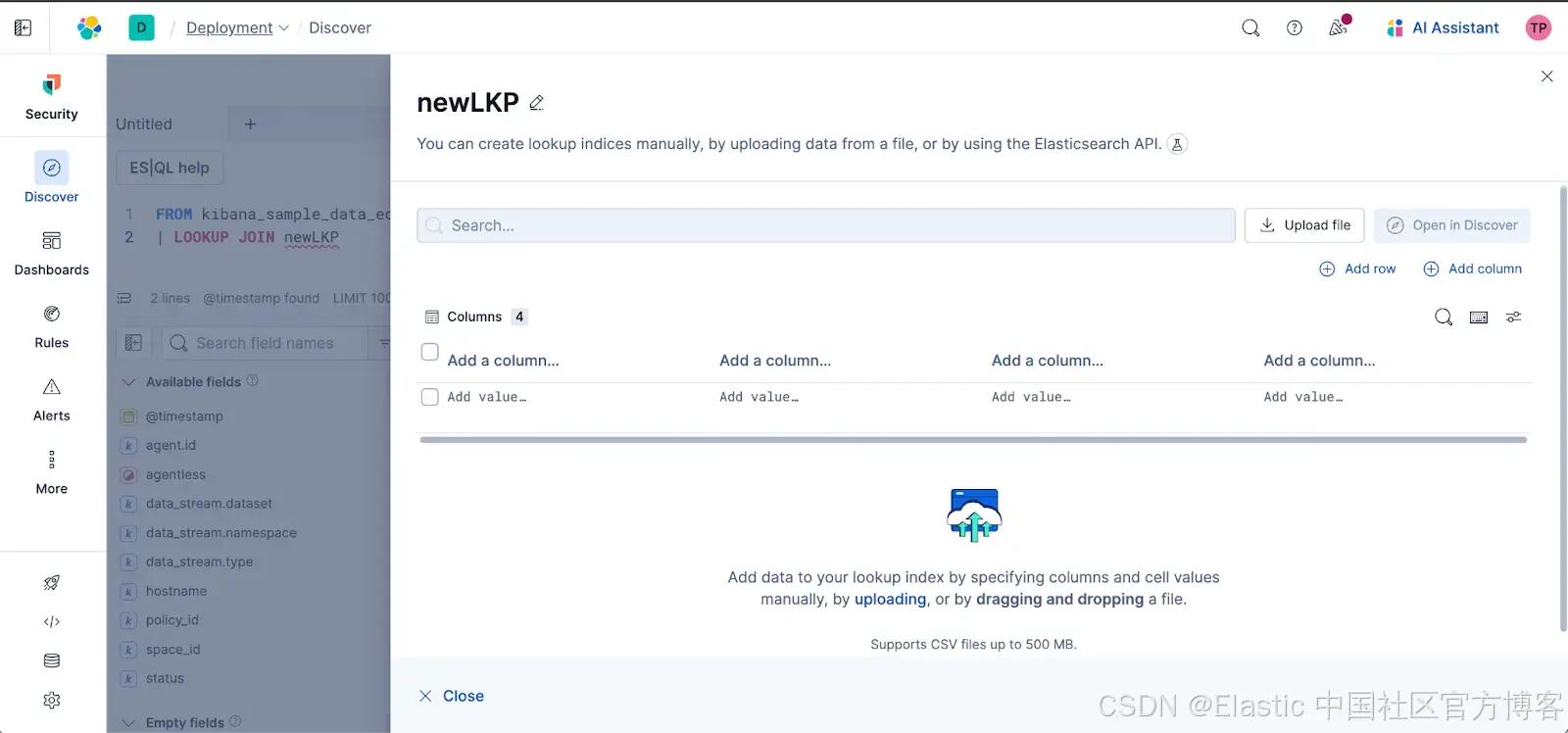 轻松文件上传:现在你可以在 Discover 中直接上传文件,例如 CSV,并立即在你的 LOOKUP JOIN 中使用。无需再在 Kibana 的不同区域来回切换上下文!