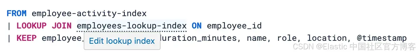 直观的工作流程:Discover 的完整自动补全会引导你完成整个过程,在 ES | QL 编辑器中建议 lookup 索引和连接字段,让你轻松将上传的数据与现有索引连接。输入不存在的 lookup 索引名称,只需点击一次即可直接进入 Lookup 编辑器创建索引。输入已有 lookup 索引名称,我们会建议编辑选项:
