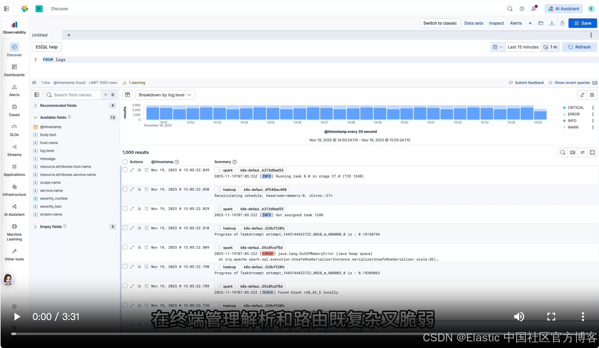 在本次研讨会中,我们探讨了 Elastic Observability 中的 Streams 如何从头到尾简化日志处理。我们将非结构化日志解析为有意义的字段,对流进行分区以保持服务井然有序,识别并对重要事件发出警报,应用保留策略,并监控数据质量。每一步都展示了 Streams 如何在摄入时处理解析、组织和治理,而不是在每个端点管理复杂性。