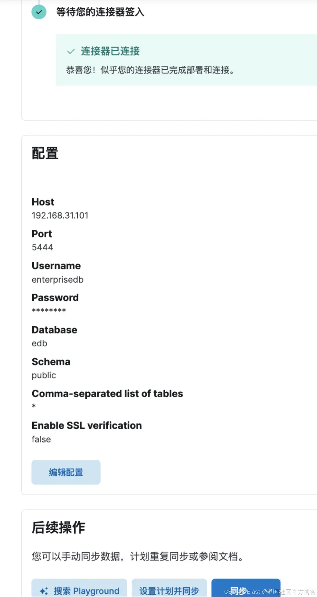 PostgreSQL 通过 Connector 连接 Elasticsearch 的主要作用是实现关系型数据库与搜索引擎之间的数据同步,将 PostgreSQL中的数据实时或准实时地复制到 ES 中,以利用 ES 强大的全文检索和分析能力。EDB EPAS 除了其高级功能外,原生完全兼容 postgresql。所以通过 Elastic Integrations 中的 PostgreSQL Connector 是可以实现 EDB 与 ES 的数据连接与同步的。