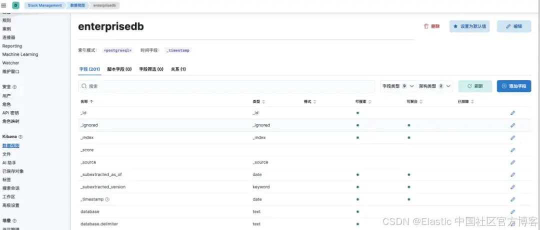 为了方便在 discover 下观测和分析,可以把该索引创建 datastream。我们创建了enterprisedb的datastream。