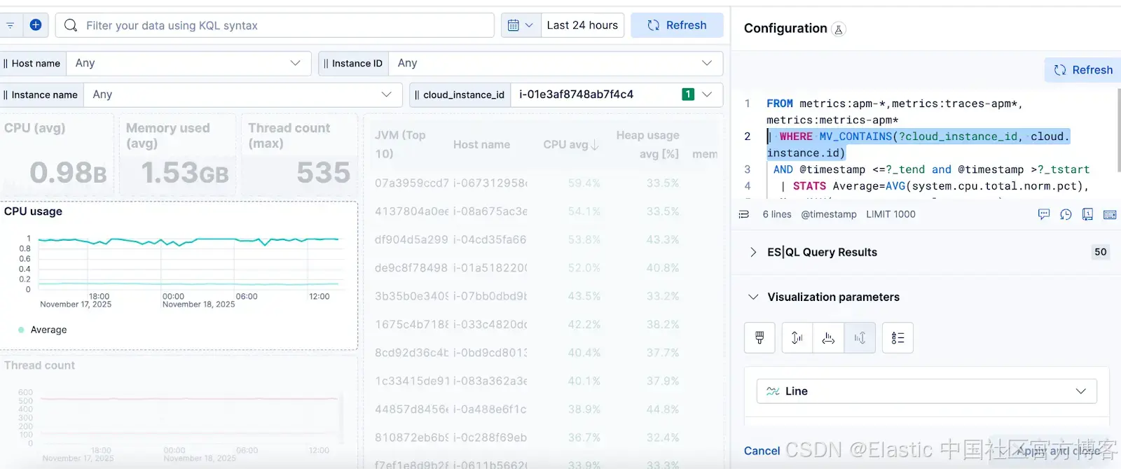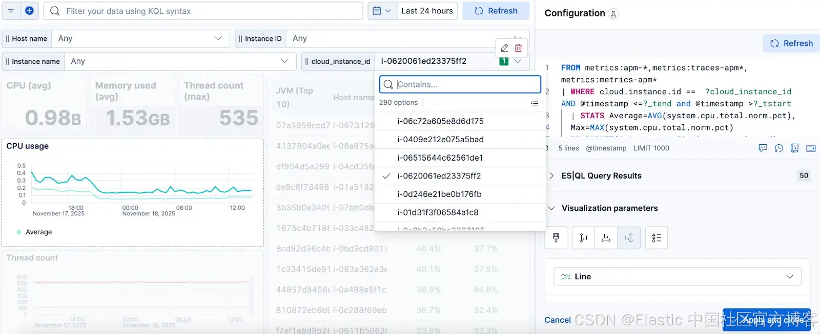 变量控件表面上看起来很相似,但它们有一个巧妙的变化:它们不会自动筛选仪表板上的每个面板,而是可以直接插入到单个可视化内部的 ES|QL 查询中。