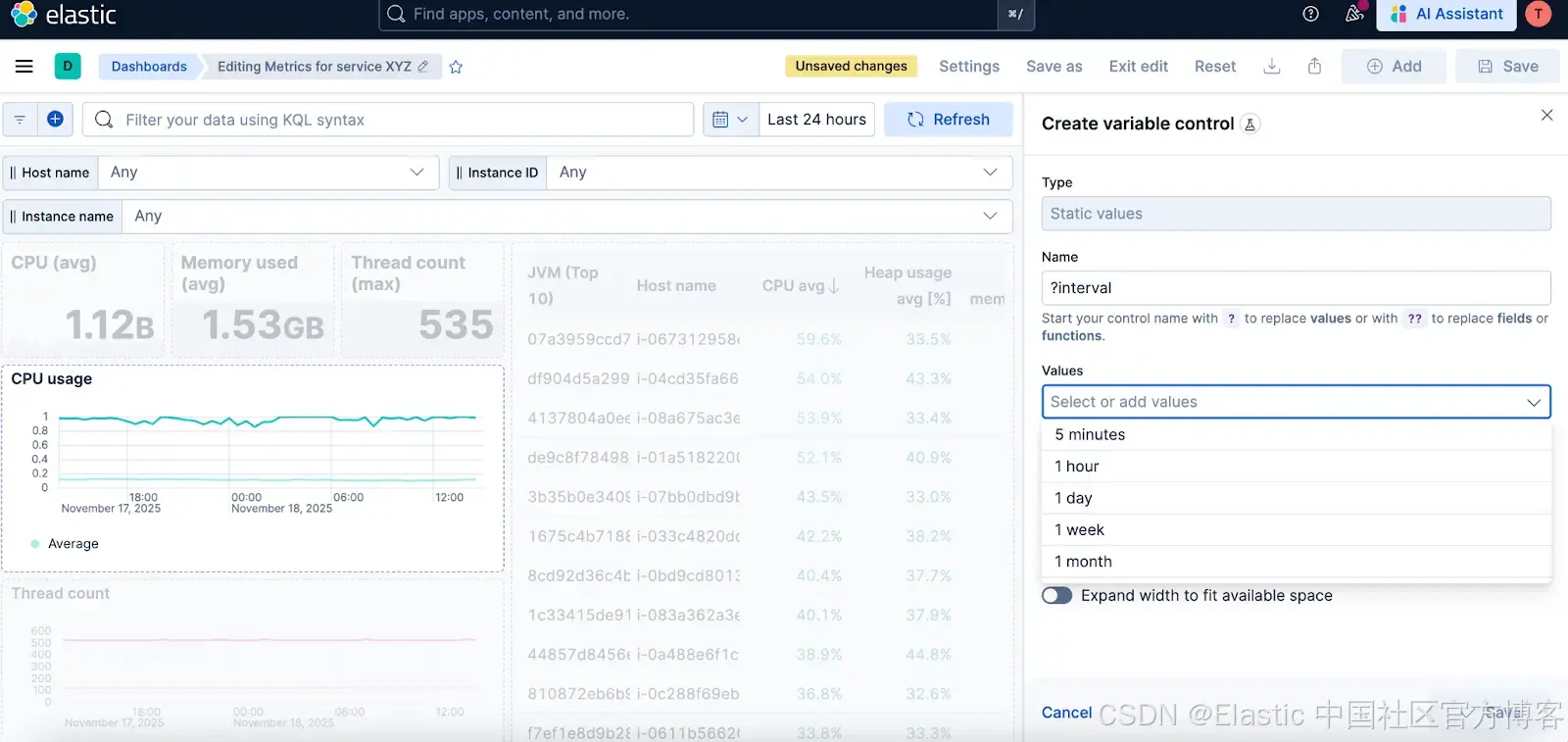 了解如何在 Kibana 8.18+ 中使用变量控件来筛选单个可视化、调整时间间隔,并按不同字段进行分组。
