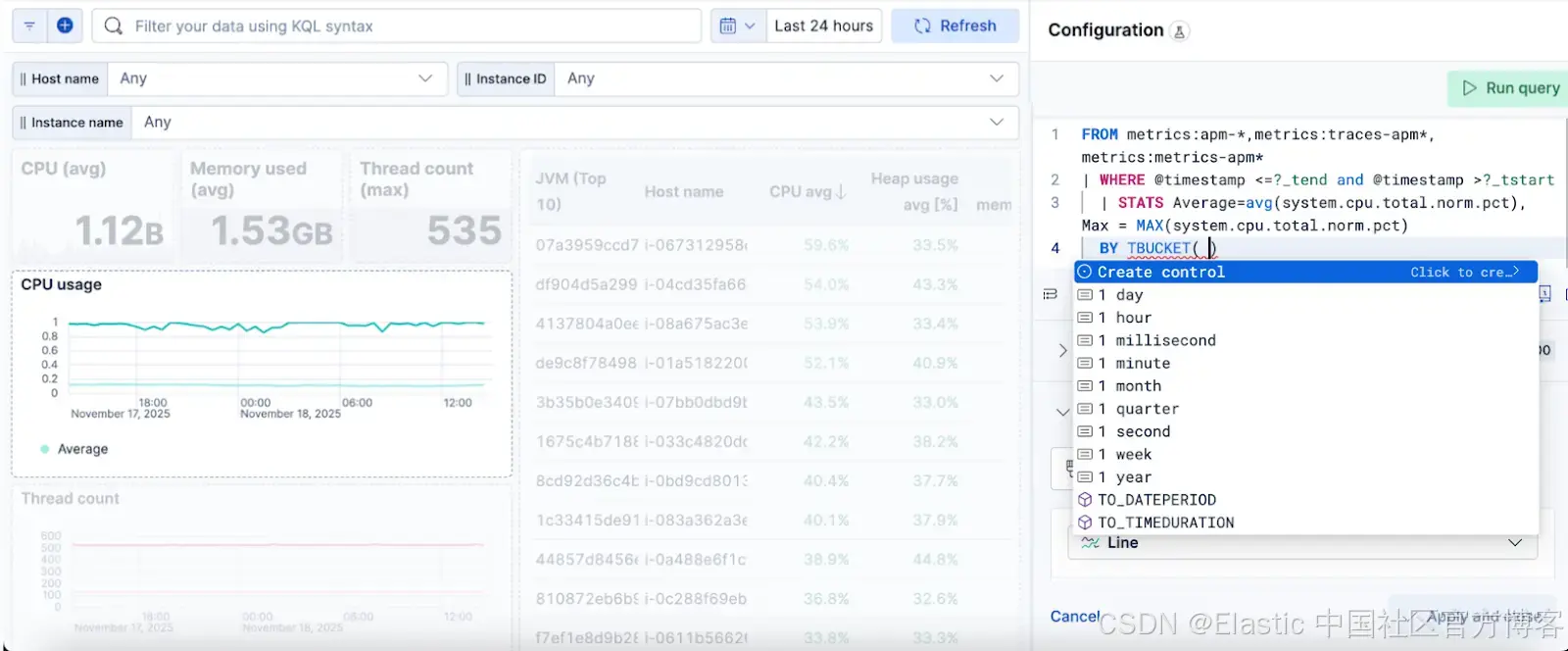 1)在为时间序列编写 ES|QL 查询时,点击 “Create control”。在为间隔创建变量时,最好使用 TBUCKET 而不是 BUCKET,这样可以接受更易读的间隔,如 “1 hour”、“1 day”等。TBUCKET 很快还会提供一个自动选项,以便根据时间范围自动调整。
