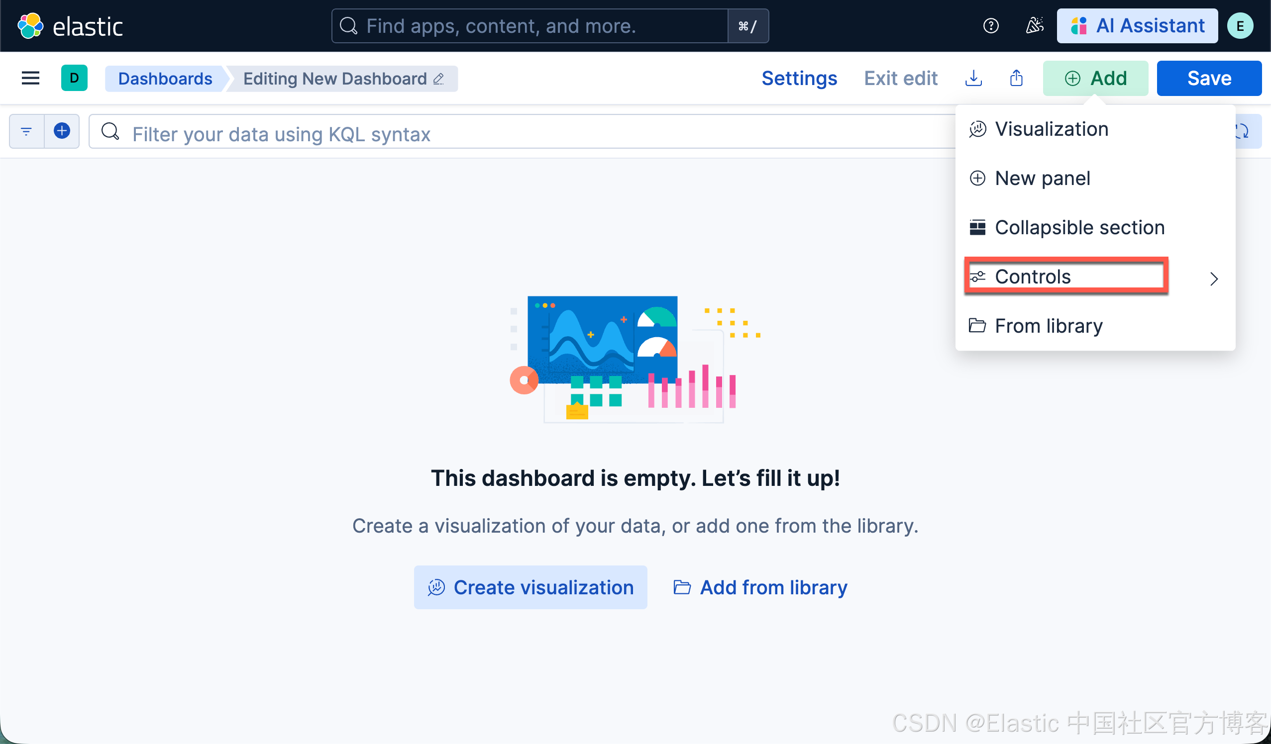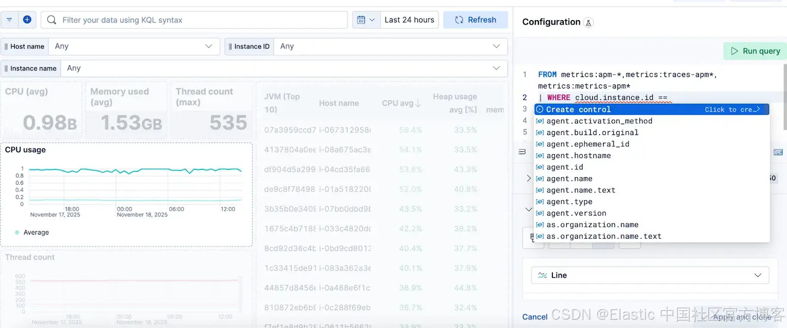 1)选择一个由 ES|QL 查询驱动的可视化,并在 WHERE 子句里点击 “Create control”