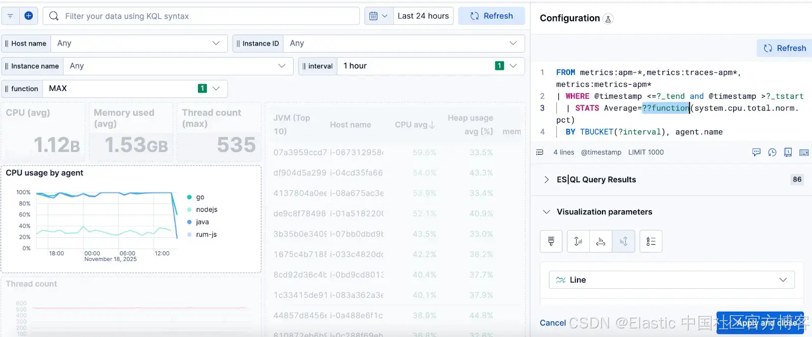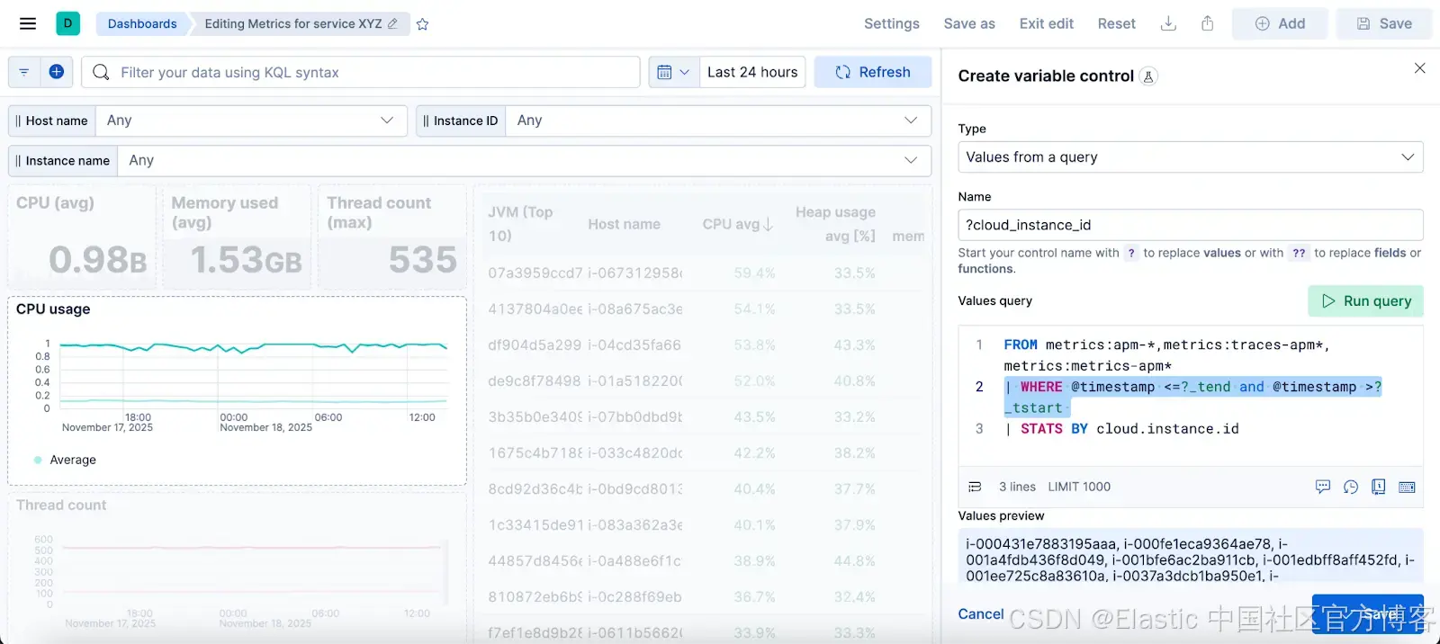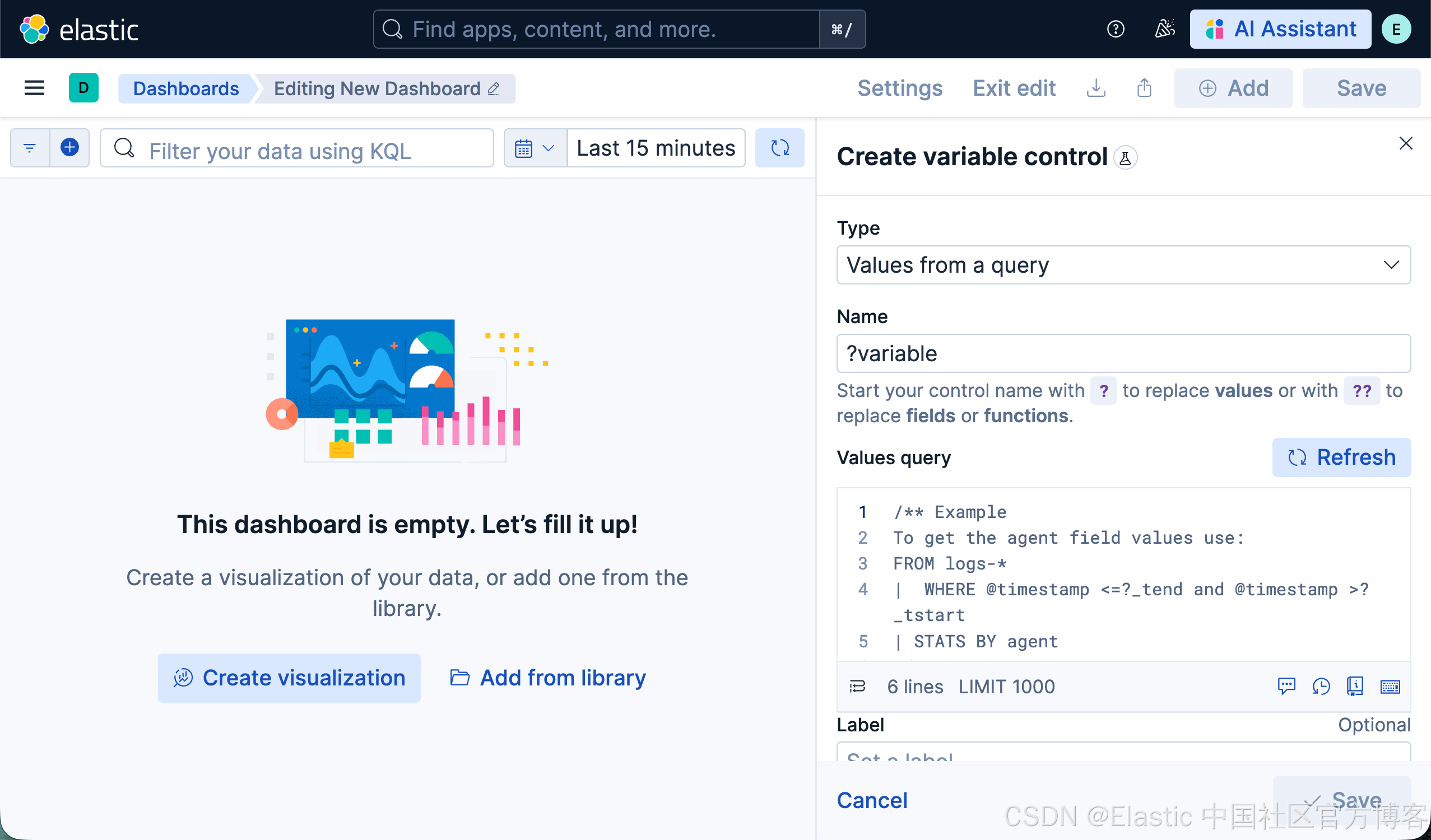创建变量控件最简单(也可能是最令人愉悦)的方式,就是直接在可视化中的 ES|QL 查询编辑器里完成。只需开始输入你的查询,使用自动完成菜单,Kibana 就会贴心地为你搭好控件的框架。