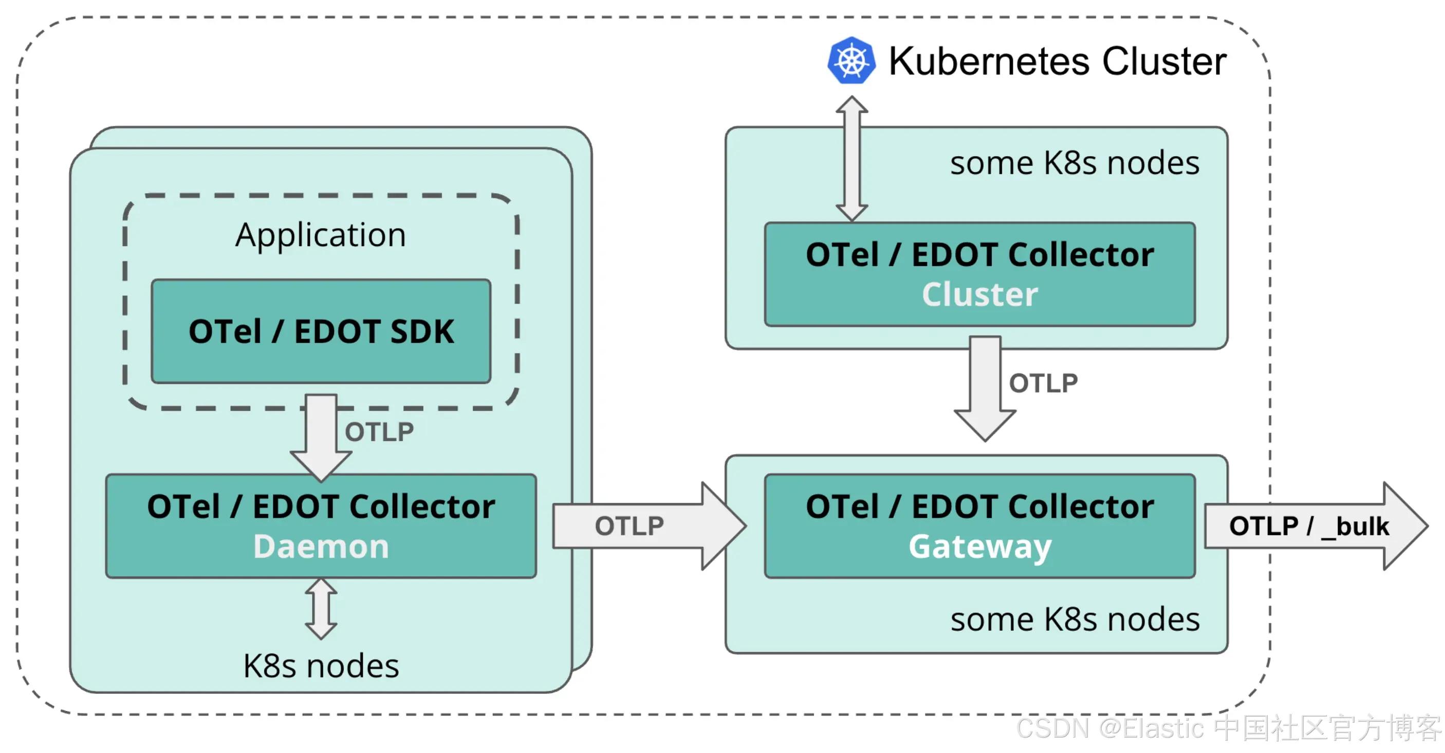 这涉及替换经典的采集和仪表化组件(如 Elastic Agent 和 Elastic APM Java Agent)。我们将逐步展示如何使用 EDOT 提供的完整组件套件完成替换。下面展示了 Kubernets 中 EDOT 架构组件的全面视图。
