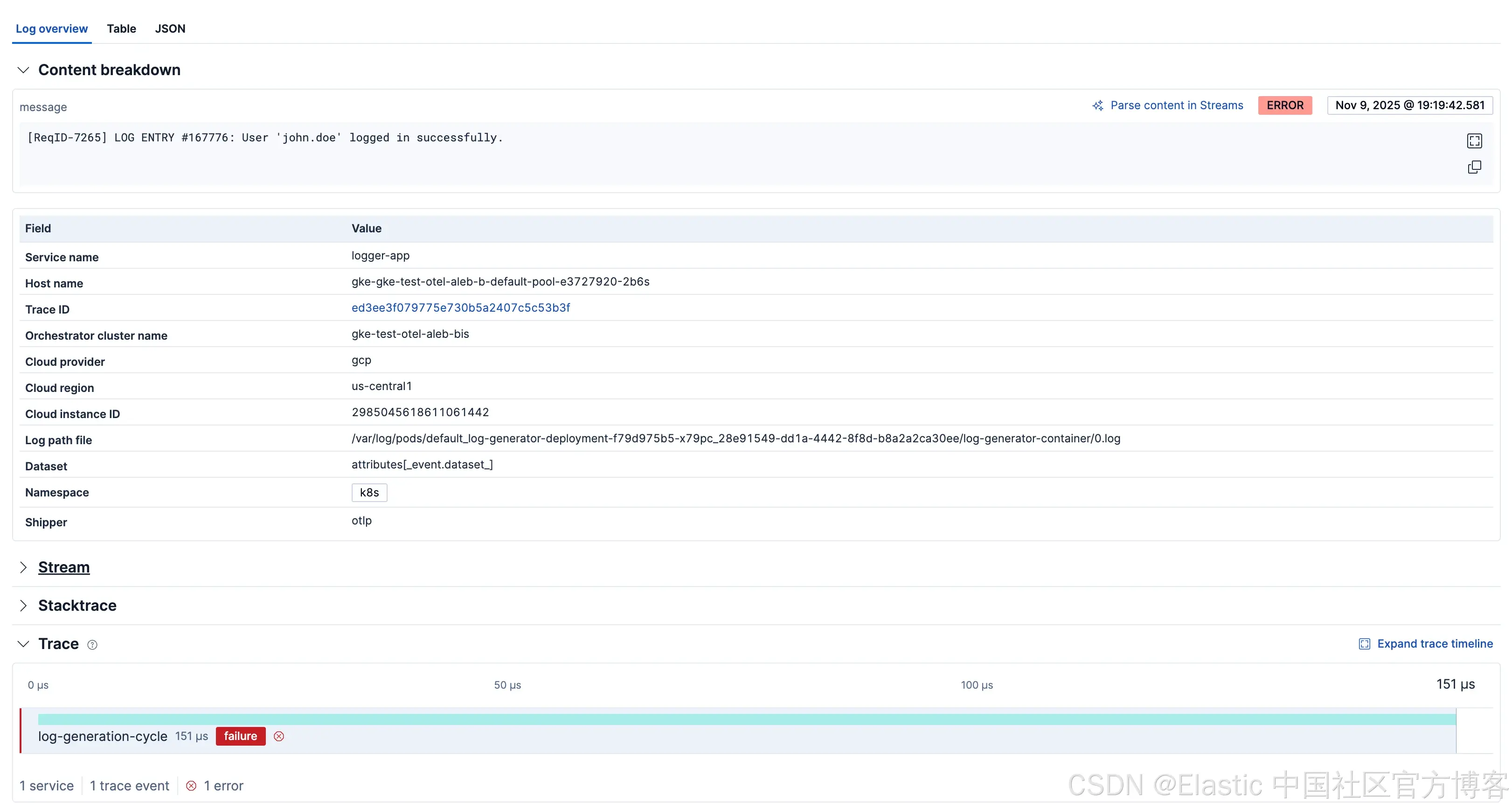 Elastic Observability 允许你通过使用 Elastic Distributions of OpenTelemetry,将 OTel traces 与 ECS 日志关联,从而拥有 OpenTelemetry 和 ECS 语义。