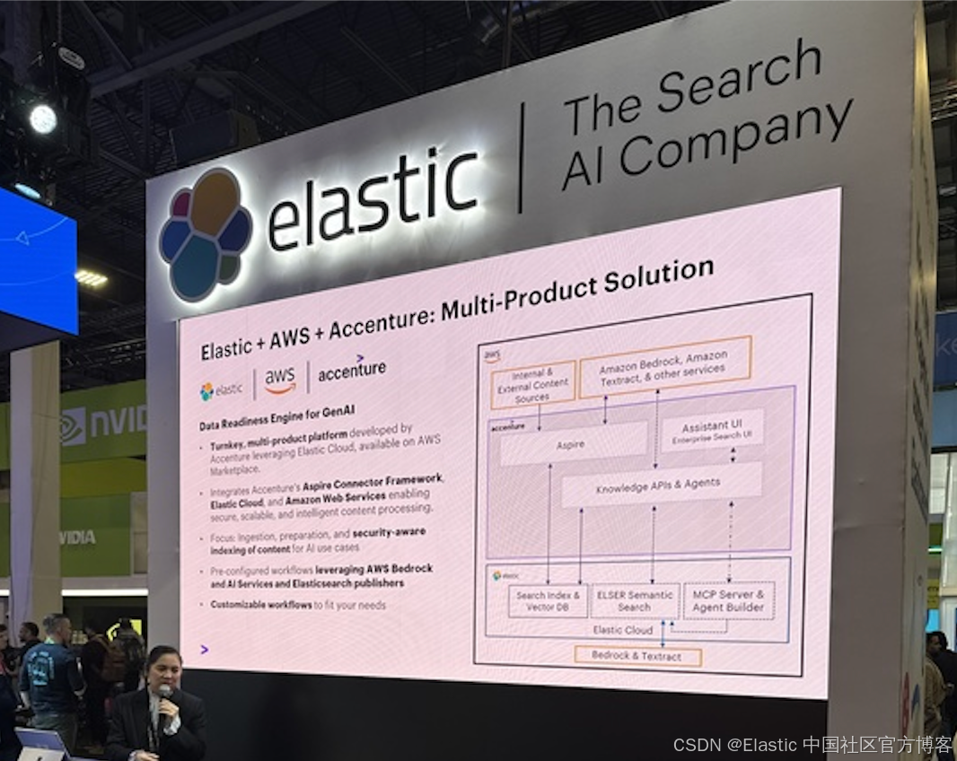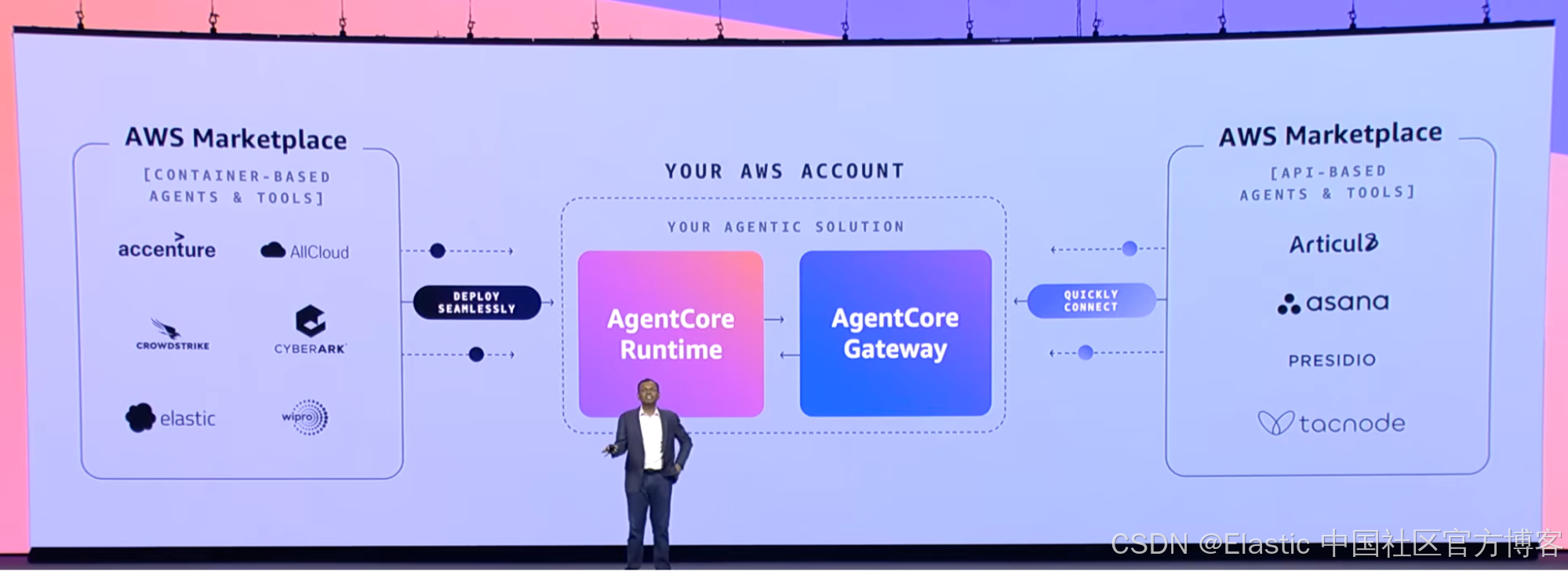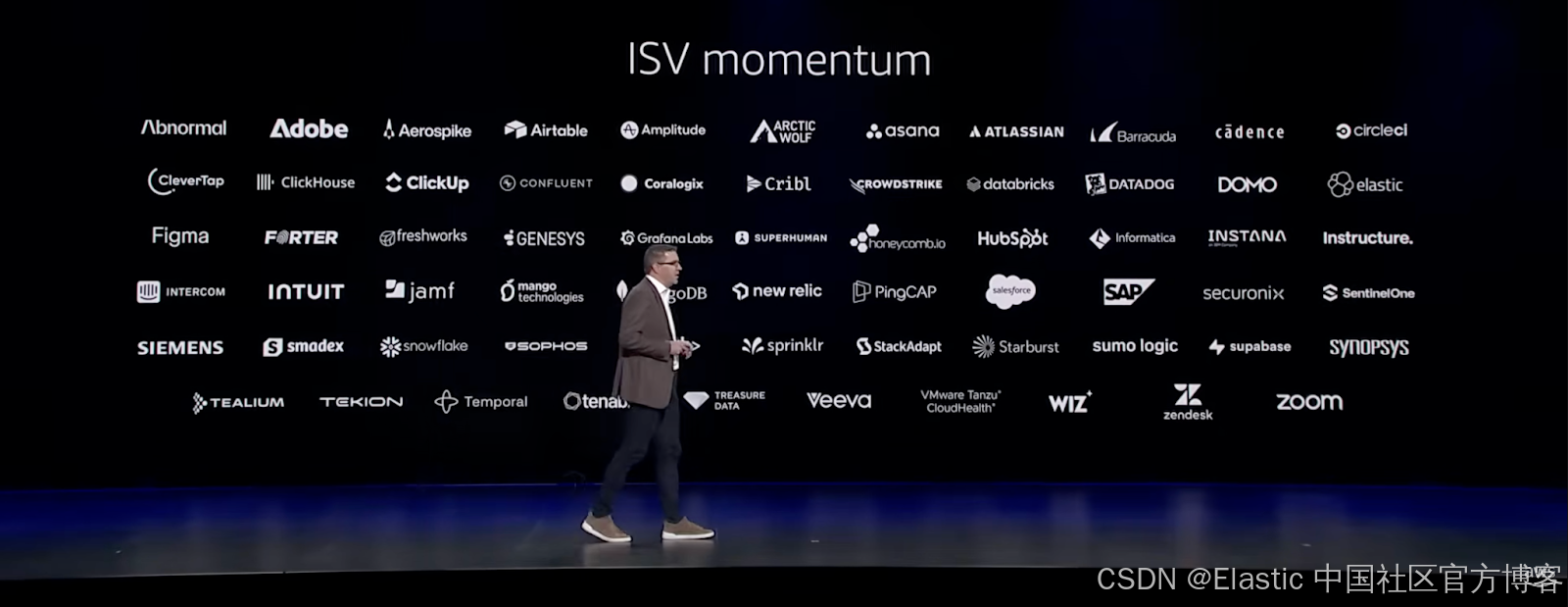 在主题演讲中,AWS Marketplace 与合作伙伴服务副总裁 Matt Yanchyshyn 特别提到了 Elastic,称其在为客户提供 agentic AI 解决方案的 AWS 合作伙伴中处于领先地位。